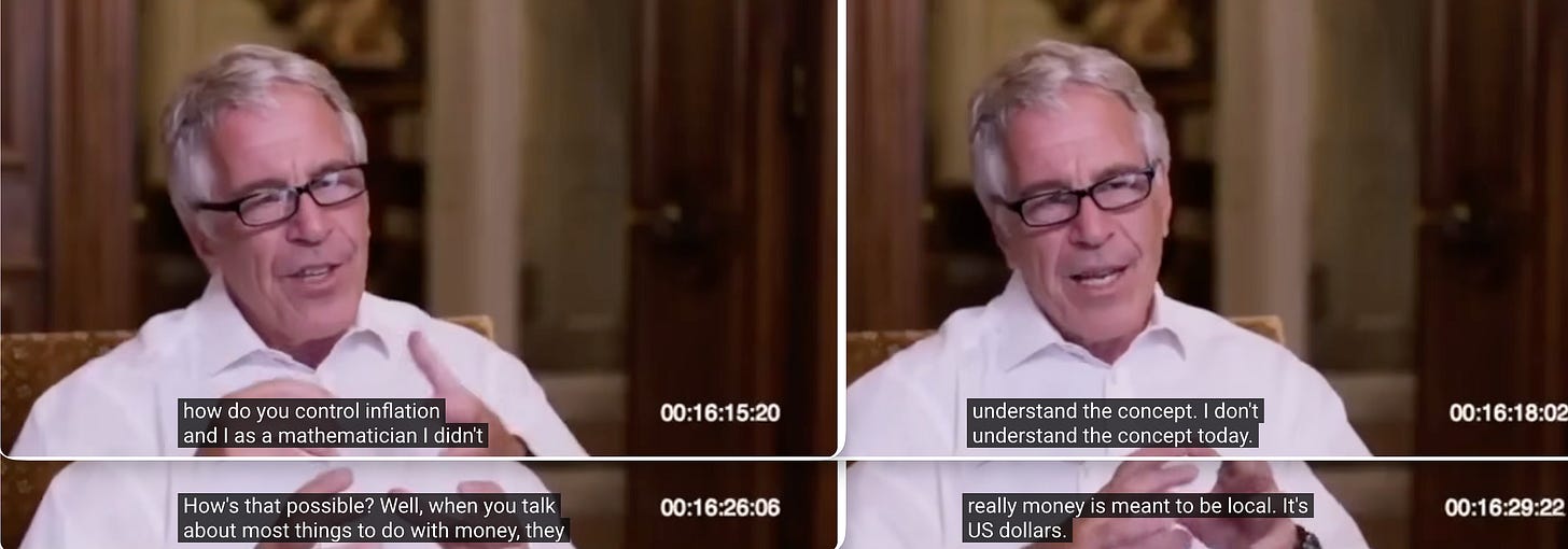 Discussing inflation and currencies with Bannon, Epstein says: ‘Money is meant to be local. It’s US dollars’. It sounds like a basic observation, but it is the central design principle of the system he was developing.