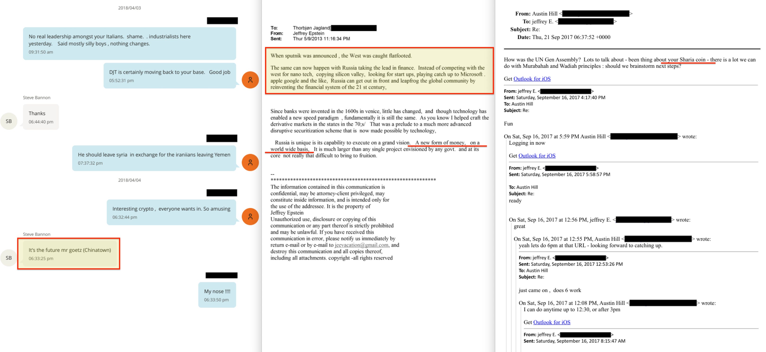 The deployment pipeline extended well beyond Bannon. In 2013, Epstein had emailed a senior Russian official connected to one of Putin’s oligarchs, arguing that Russia could ‘leapfrog the global community by reinventing the financial system of the 21st century’40. In October 2016, he pitched a Sharia-compliant digital currency41 to a Saudi royal court adviser.