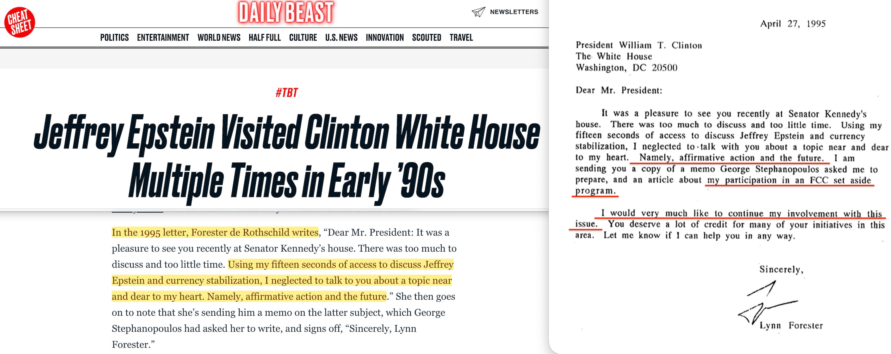 This was the justification for everything that followed. On 27 April 1995, Lynn Forester wrote a personal letter to President Clinton describing a recent meeting at Senator Kennedy’s house5: ‘Using my fifteen seconds of access to discuss Jeffrey Epstein and currency stabilization, I neglected to talk with you about a topic near and dear to my heart. Namely, affirmative action and the future’.