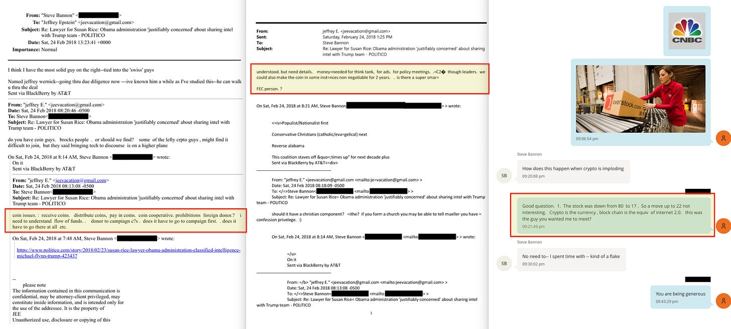 Simultaneously, Epstein was exploring crypto as infrastructure for Bannon’s own political movement. ‘I need to understand flow of funds’, he wrote3435, adding there would be ‘money needed for think tank, for ads, for policy meetings’36. He proposed cryptocurrency as an option and encouraged Bannon to study blockchain. Bannon agreed3738: ‘crypto is the currency, blockchain is the equivalent of internet 2.0’.