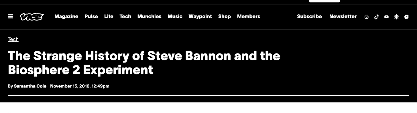 Bannon listens as though encountering these ideas for the first time. He was not. In the same interview, he mentions that ‘when Chris came to Biosphere 2 for the first big conference we had in 1994, he was one of the most impressive guys there’ — listing attendees from Kew Gardens, Lawrence Livermore Lab, Sandia, Lamont-Doherty, and Woods Hole.