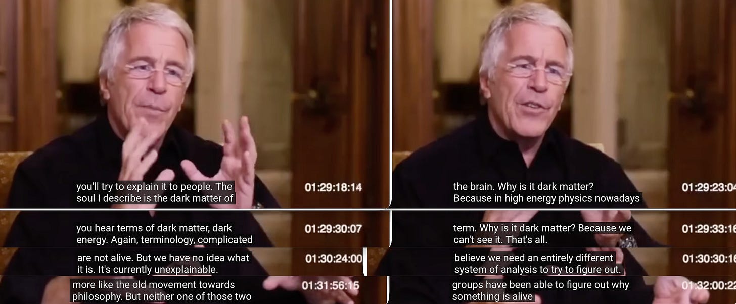 Epstein discusses the soul, consciousness, and the limits of science. He says that ‘the soul is the dark matter of the brain’ — something whose effects can be observed but whose nature cannot be explained. He describes the difference between things that are alive and things that are dead as ‘currently unexplainable’ and says he believes ‘we need an entirely different system of analysis to try to figure out’ what animates living things.