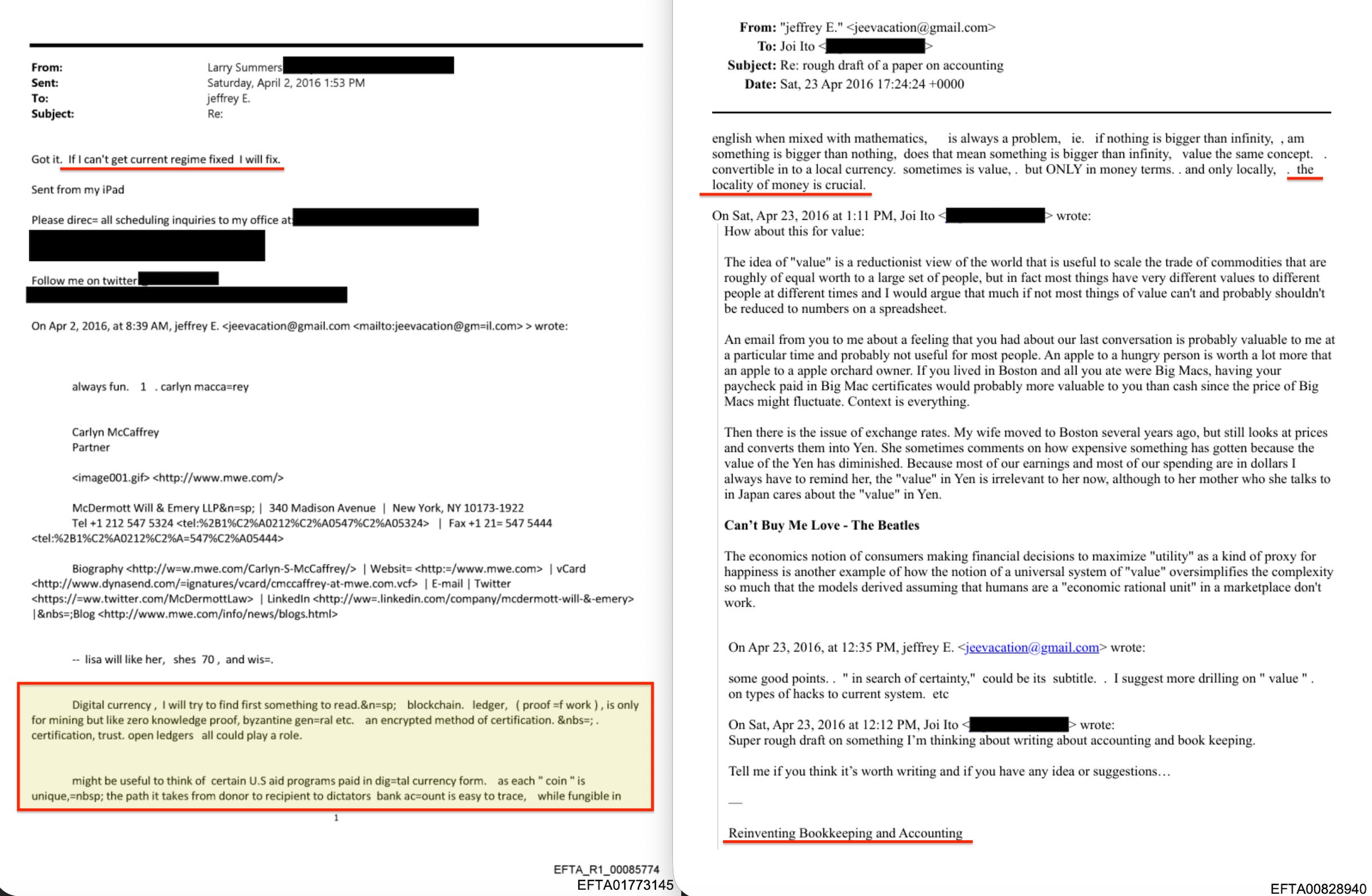 On 2 April 2016, Larry Summers emailed Epstein a specification for sovereign digital currency: each unit uniquely numbered, every transaction traceable, aid disbursement as the entry vector into developing economies. Summers’s reply in the same thread14: ‘Got it. If I can’t get current regime fixed I will fix’.