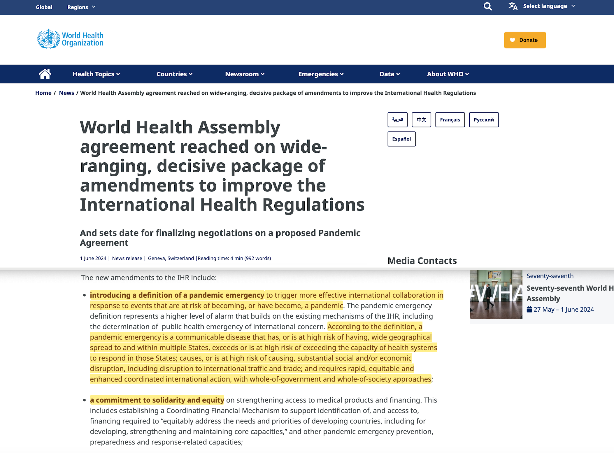 Under IHR, the WHO Director-General can declare a PHEIC (Public Health Emergency of International Concern) and issue temporary recommendations (non-binding but highly shaping for travel/trade). The 2024 amendments5 add a higher alert — ‘pandemic emergency’6 — with criteria and timing rules; these amendments enter into force 19 Sep 20257.