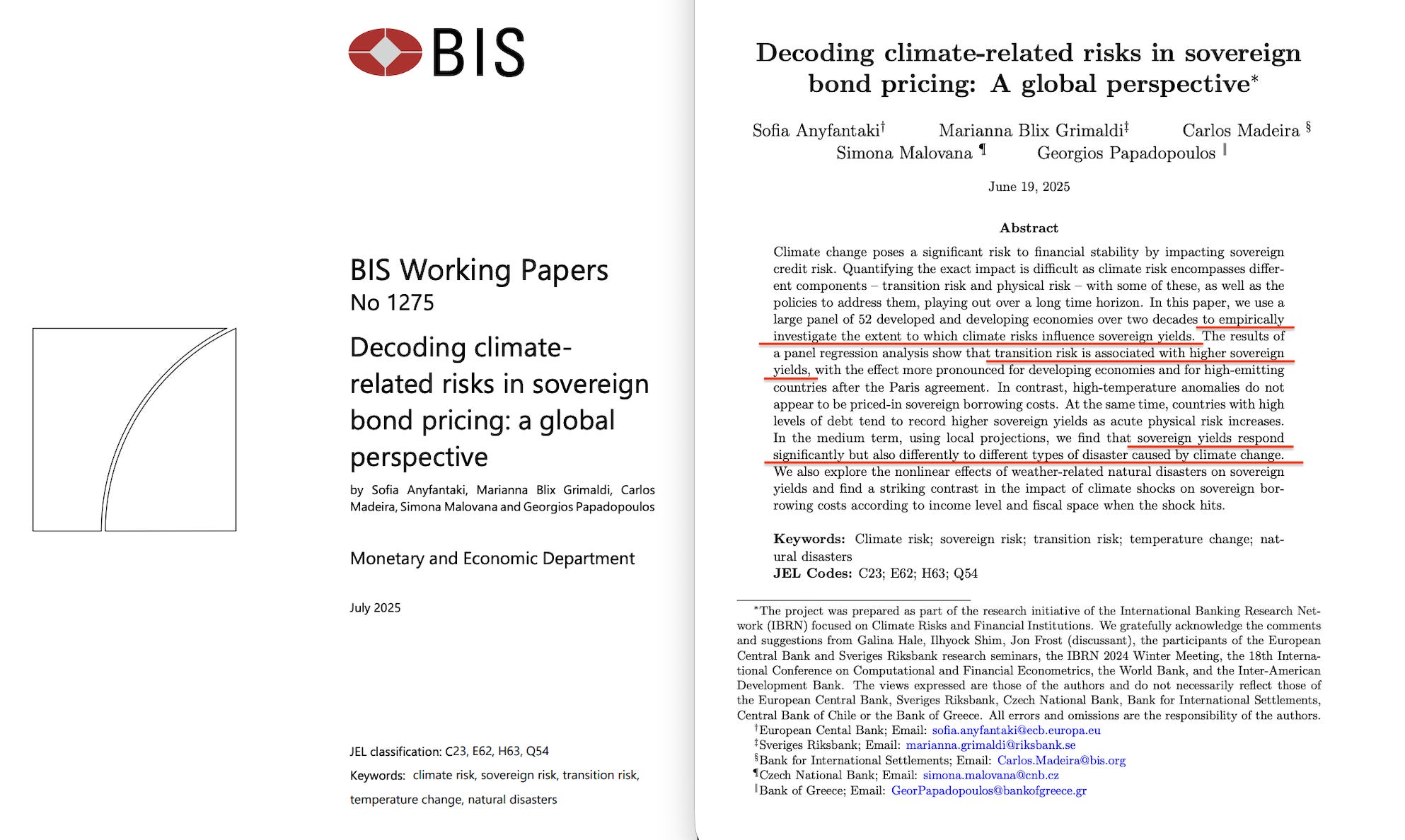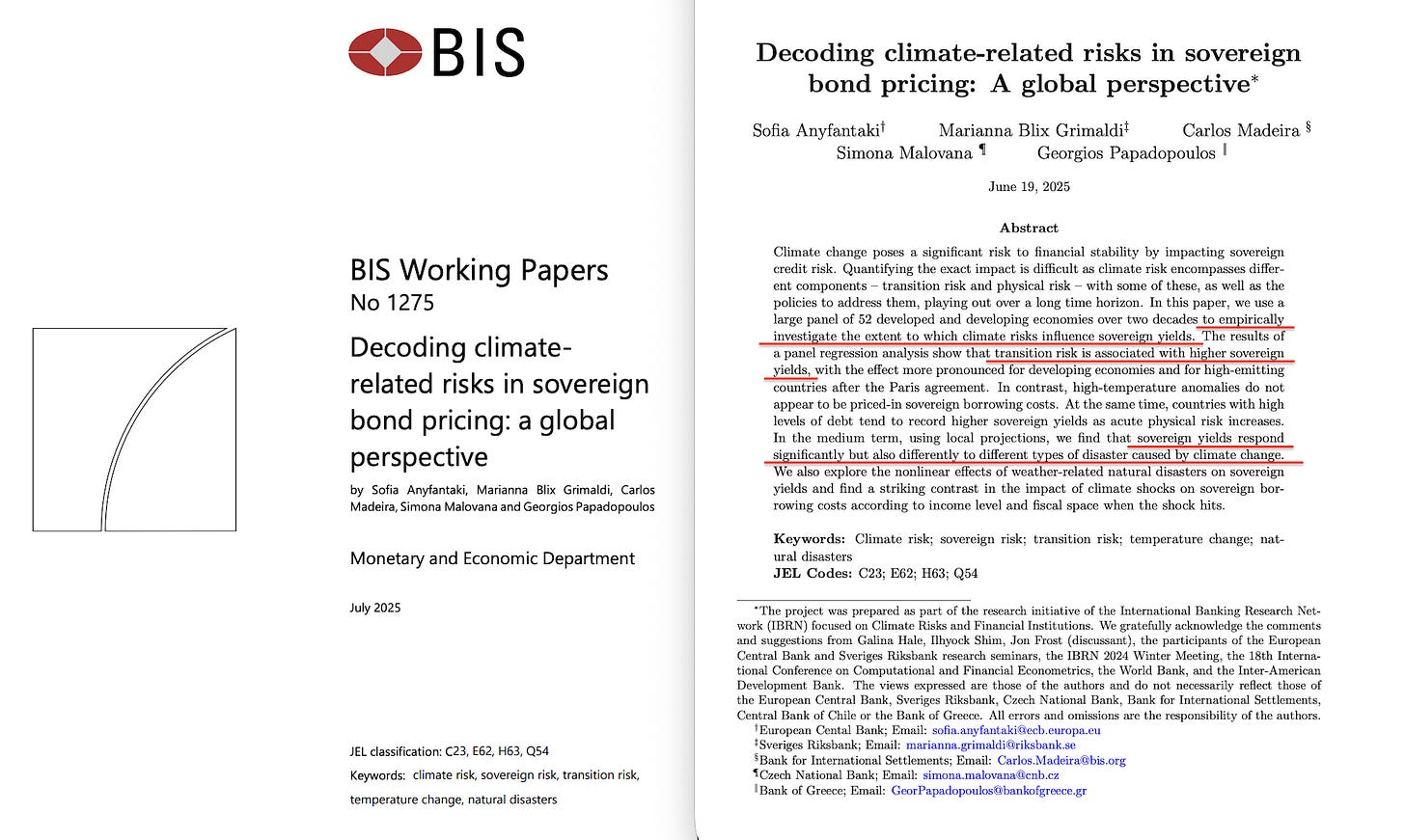 In July 2025, the BIS published ‘Decoding climate-related risks in sovereign bond pricing’68. Researchers from the ECB, Sveriges Riksbank, Czech National Bank, Central Bank of Chile, and Bank of Greece examined fifty-two countries over two decades. The finding: