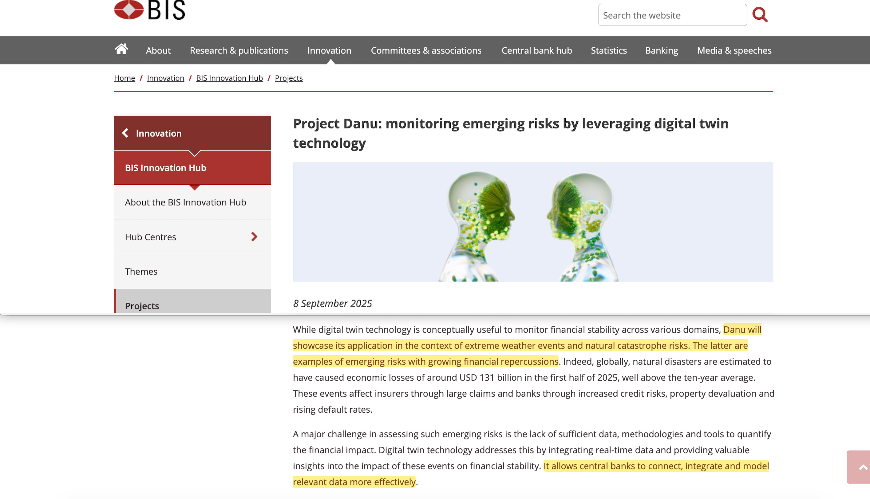 Project Danu, announced in September 2025, extends the surveillance architecture to physical and nature-related risks32. The project develops a ‘digital twin’ — a virtual model integrating climate data, geographic information, and financial exposure mapping.