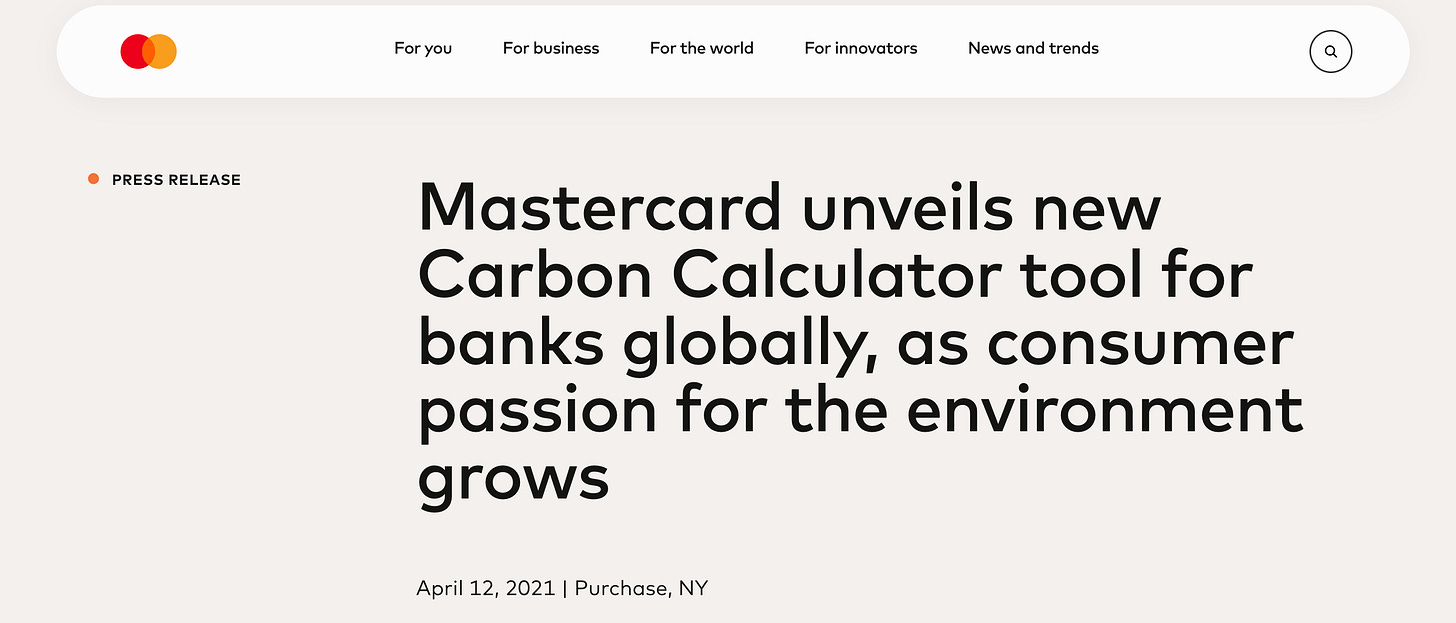 Project Rosalind’s multi-party lock can enforce conditions on any transaction. The EU Taxonomy defines which economic activities are sustainable. Mastercard’s Carbon Calculator, developed with Swedish fintech Doconomy, already tracks the carbon footprint of individual purchases across millions of cards73.