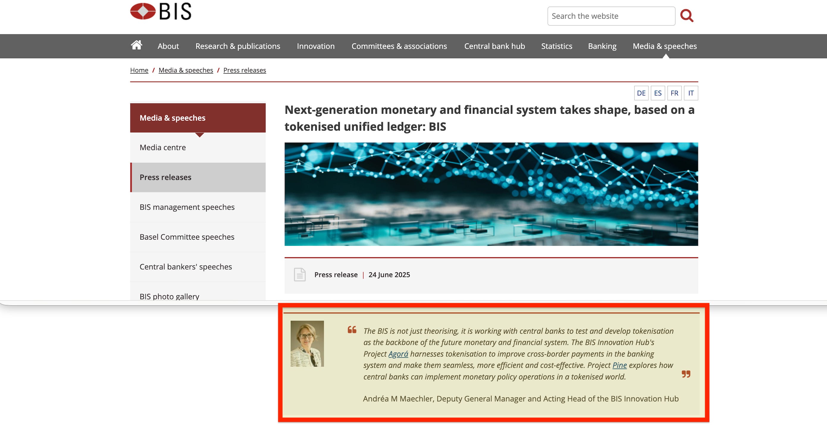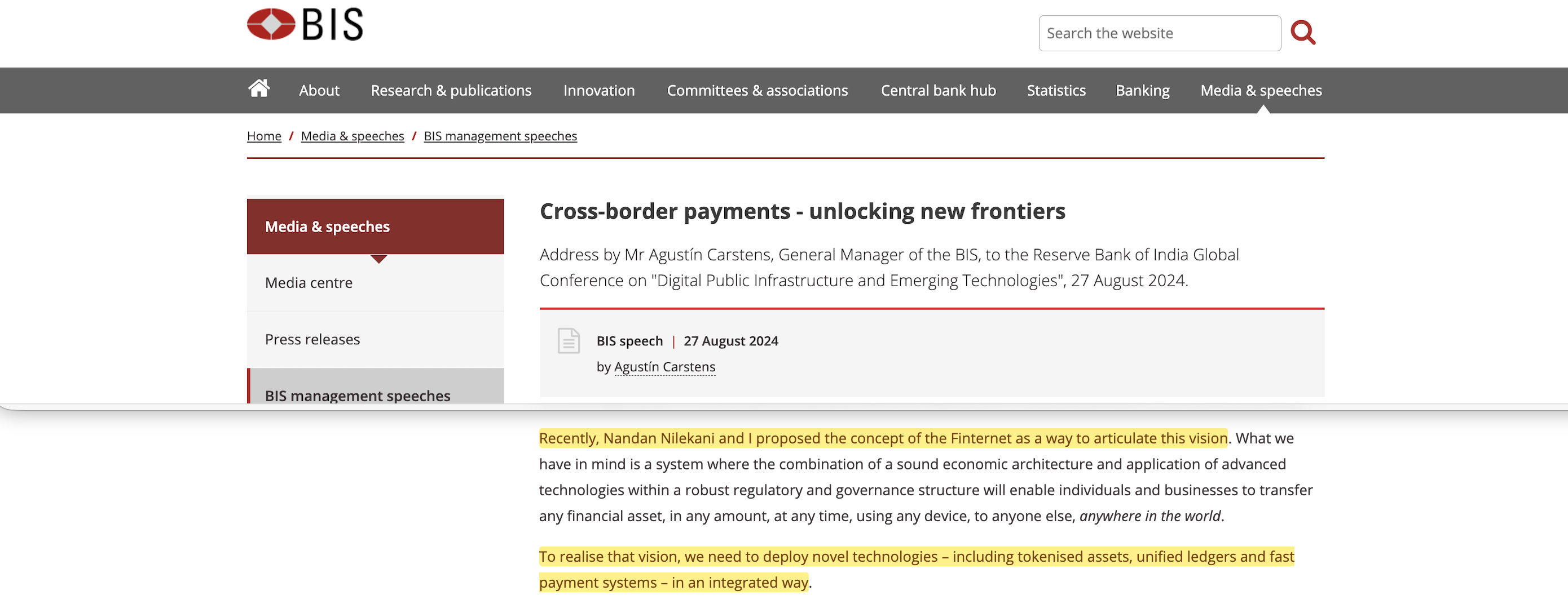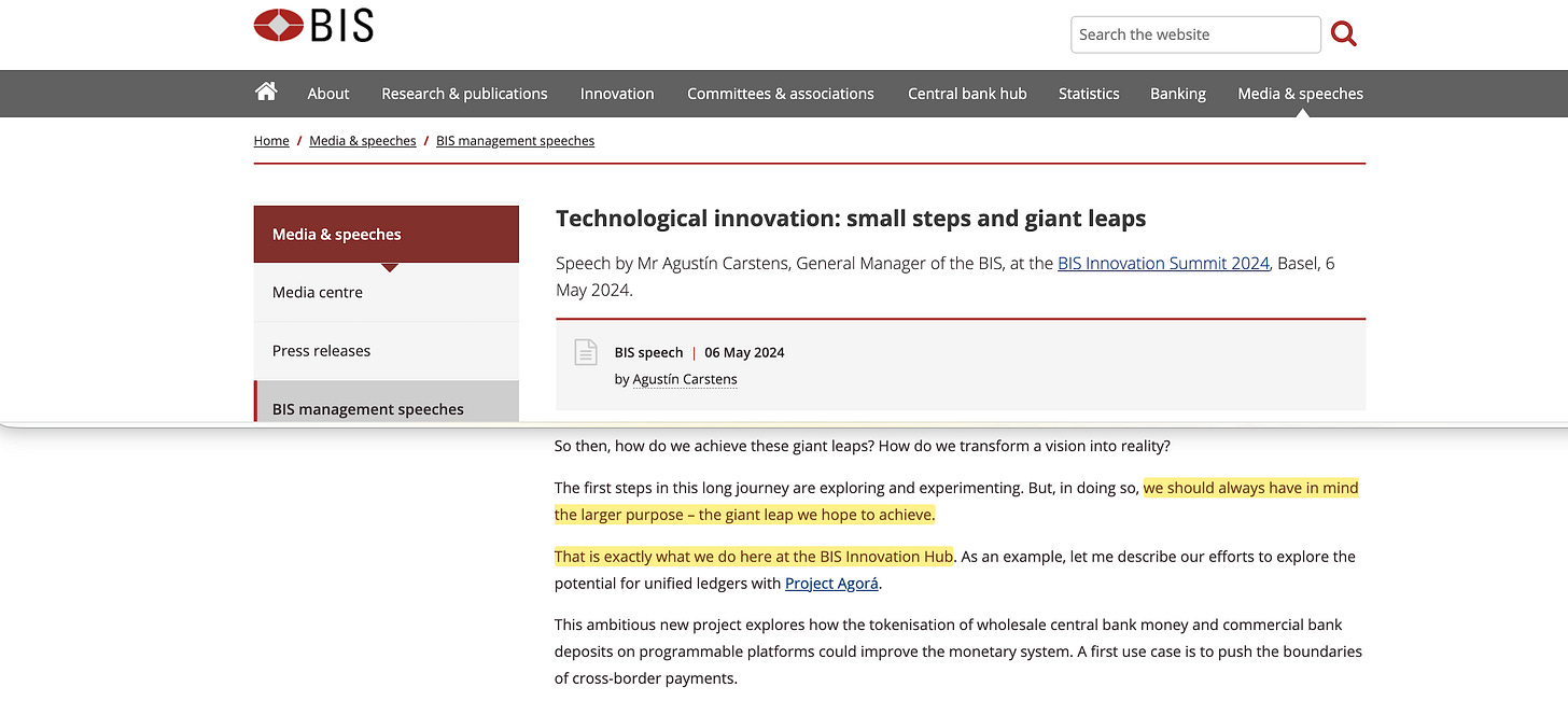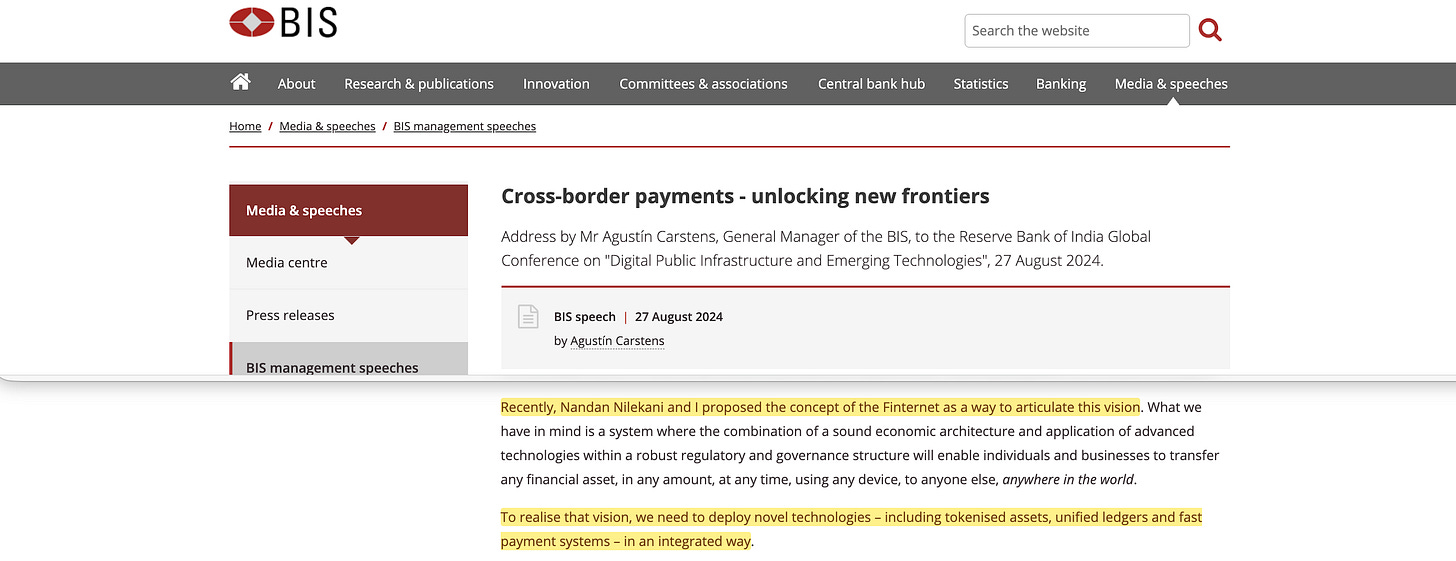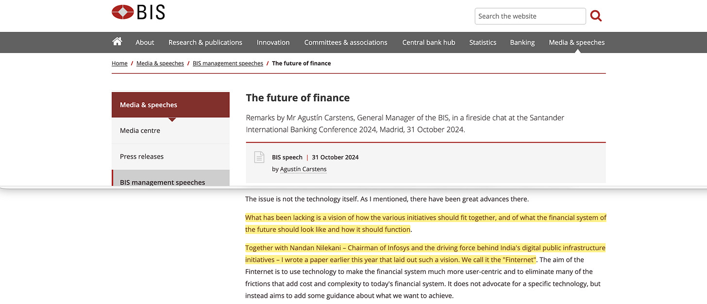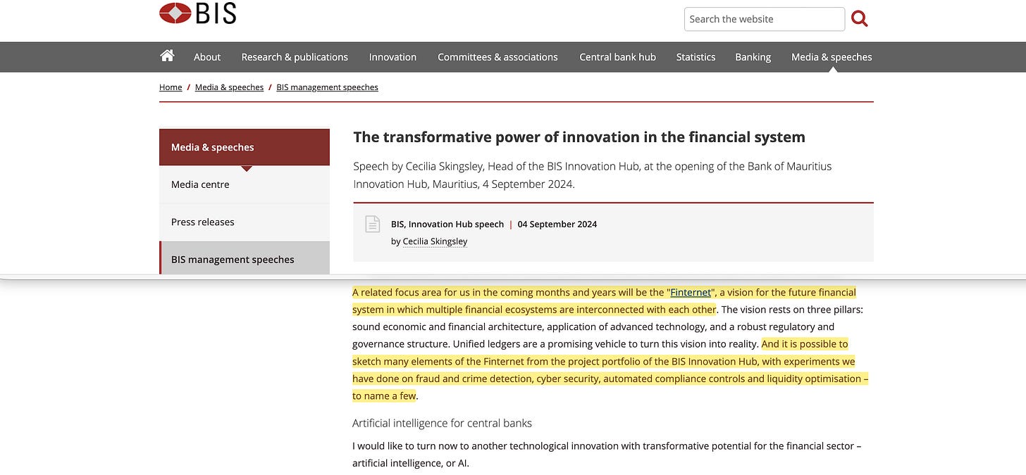 In September 2024, his deputy Cecilia Skingsley confirmed the connection to the existing project portfolio: ‘It is possible to sketch many elements of the Finternet from the project portfolio of the BIS Innovation Hub, with experiments we have done on fraud and crime detection, cyber security, automated compliance controls and liquidity optimisation’.