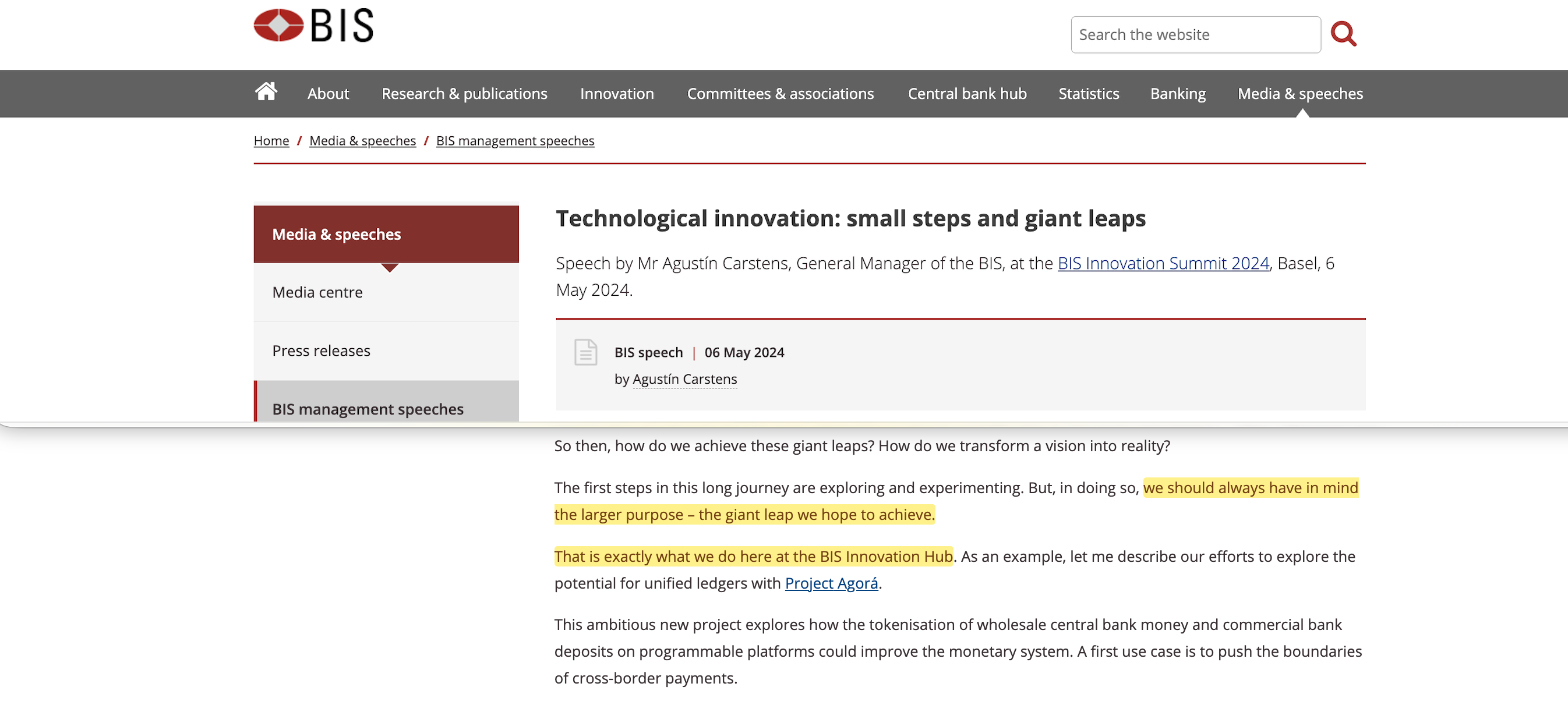 In May 2024, opening the BIS Innovation Summit in Basel, Carstens told the audience that individual experiments should ‘always have in mind the larger purpose — the giant leap we hope to achieve. That is exactly what we do here at the BIS Innovation Hub’2.