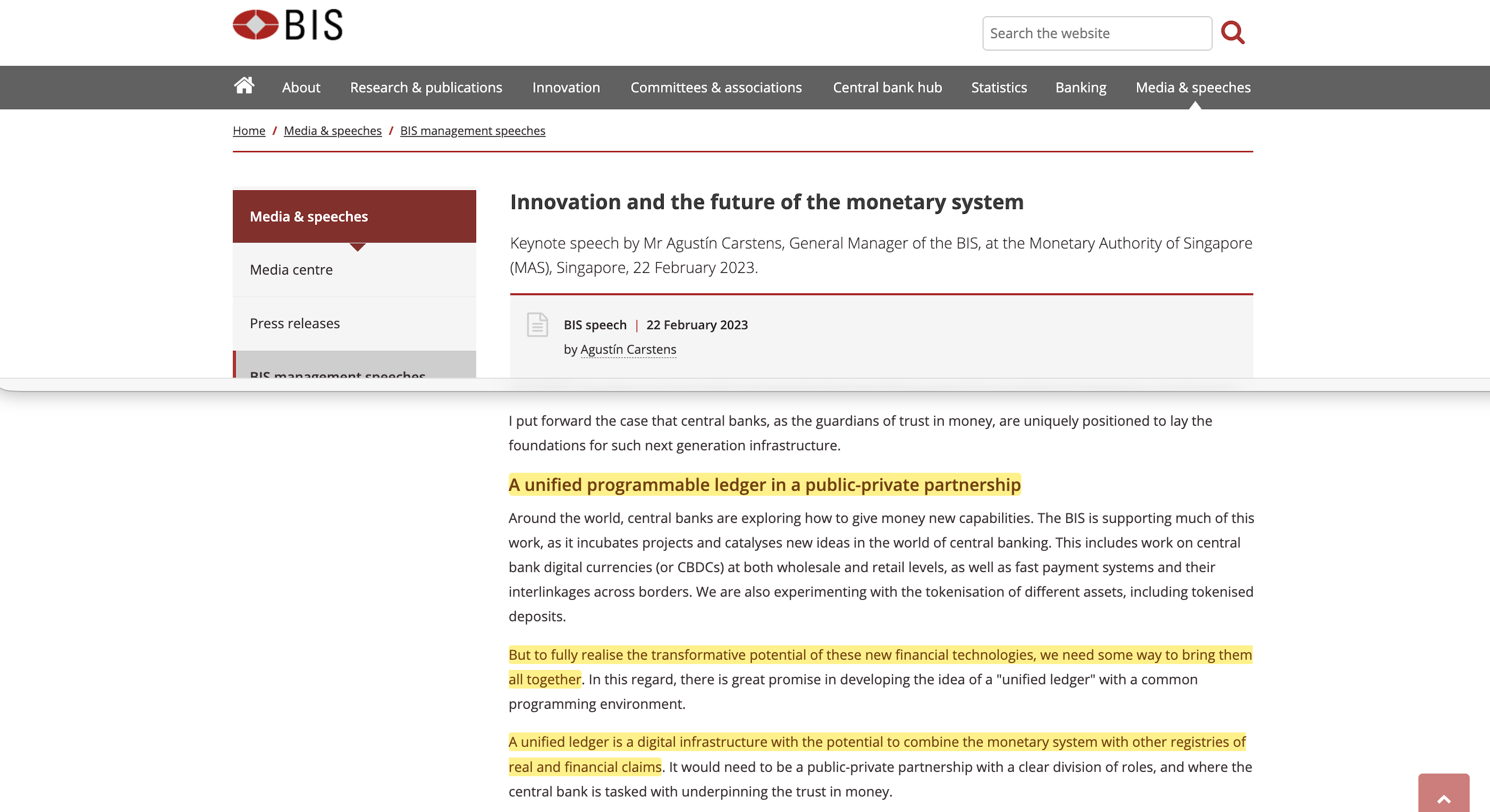 In February 2023, Agustín Carstens delivered a keynote at the Monetary Authority of Singapore in which he described the individual Innovation Hub projects and added: ‘But to fully realise the transformative potential of these new financial technologies, we need some way to bring them all together’1.