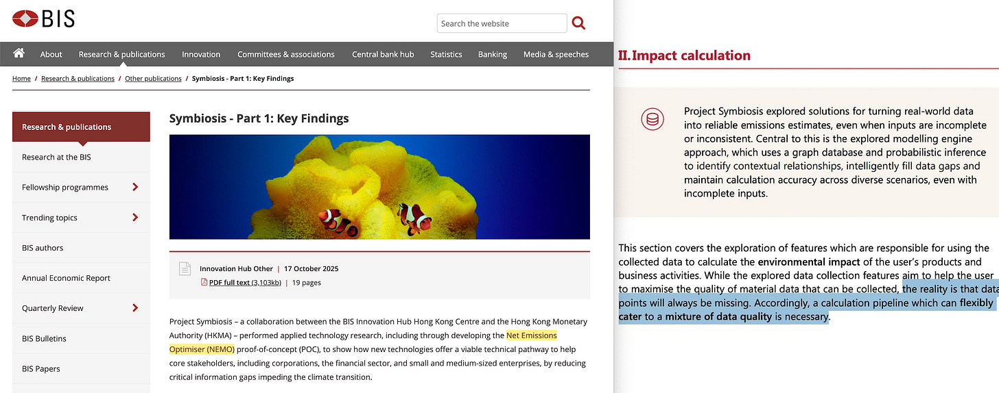 NEMO is an artificial intelligence engine that generates emissions figures for entities that have never reported. It combines sector classification, location data, and financial proxies to produce facility-level estimates. The BIS documentation states that NEMO ‘can model emissions even in data-scarce environments’31.