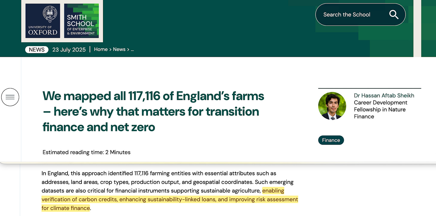 A farm in England that has never engaged with climate disclosure finds its land mapped, its emissions estimated, and its risk profile assigned by AI systems trained on satellite imagery and natural language processing. The July 2025 Smith School dataset documented 117,116 farming entities mapped to ownership without the farmers’ participation66.