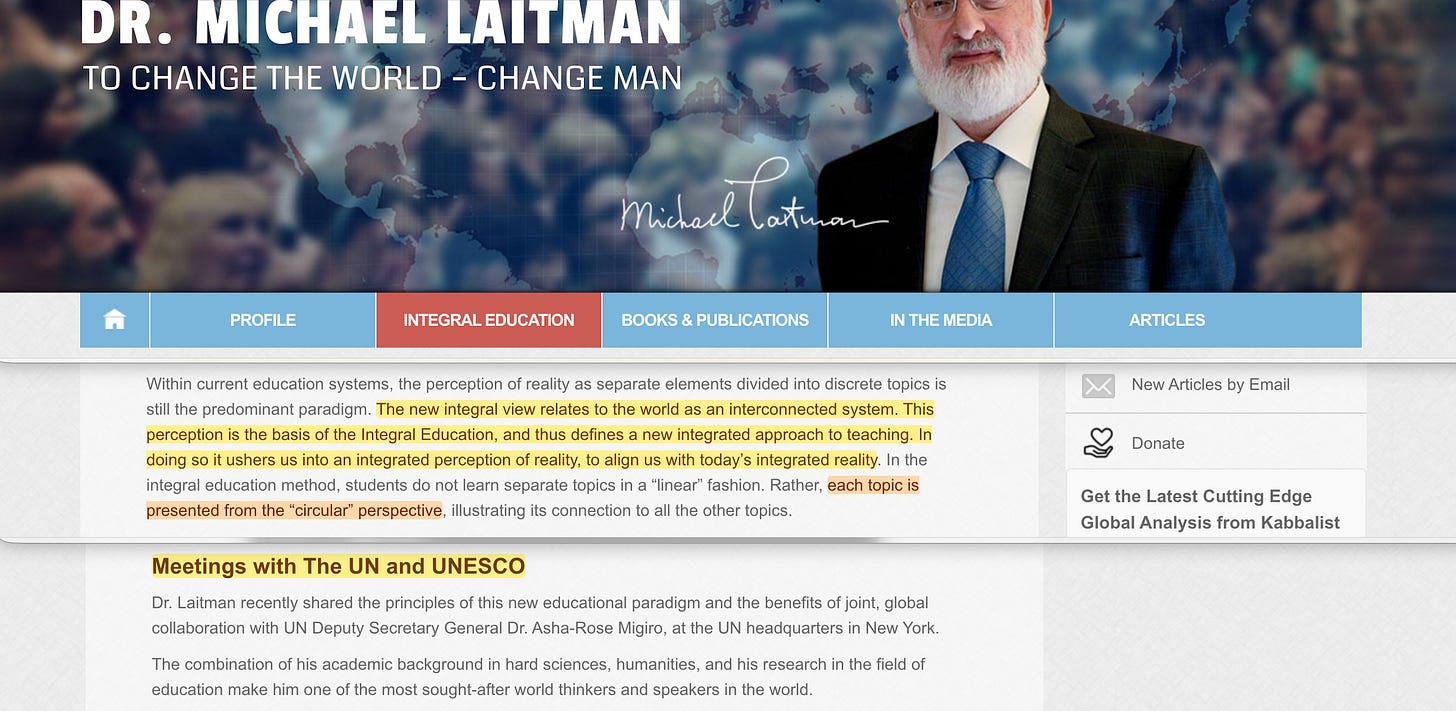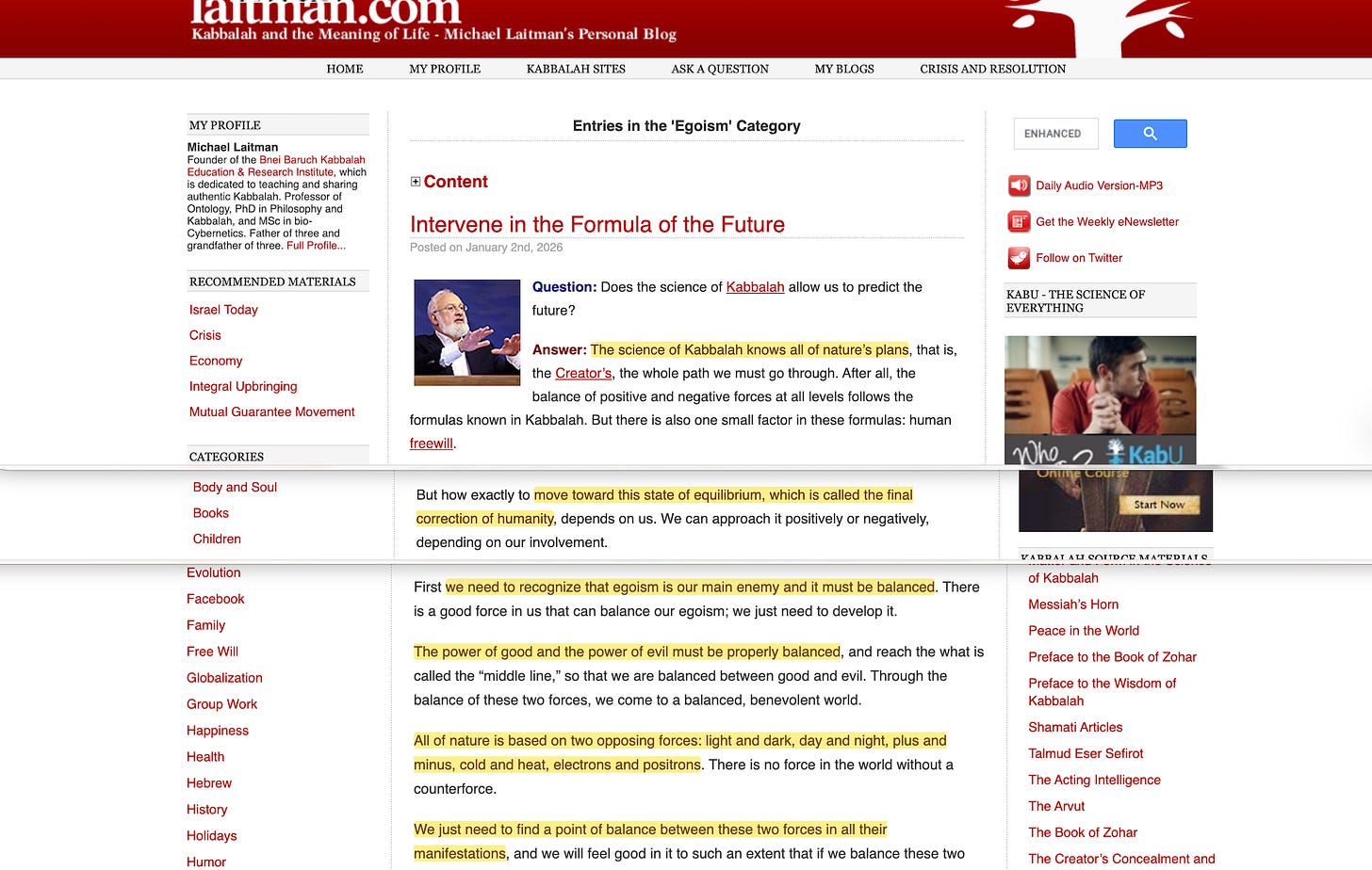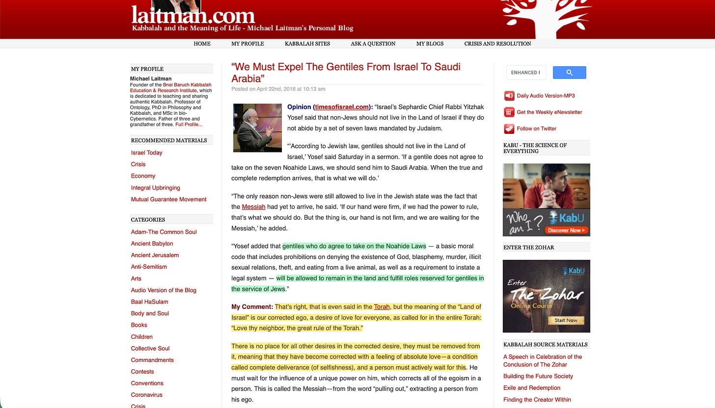 Laitman has published over forty books, delivers regular lectures, and runs courses translated into dozens of languages. His teachings are publicly available, systematically presented — and explicitly political in their implications.