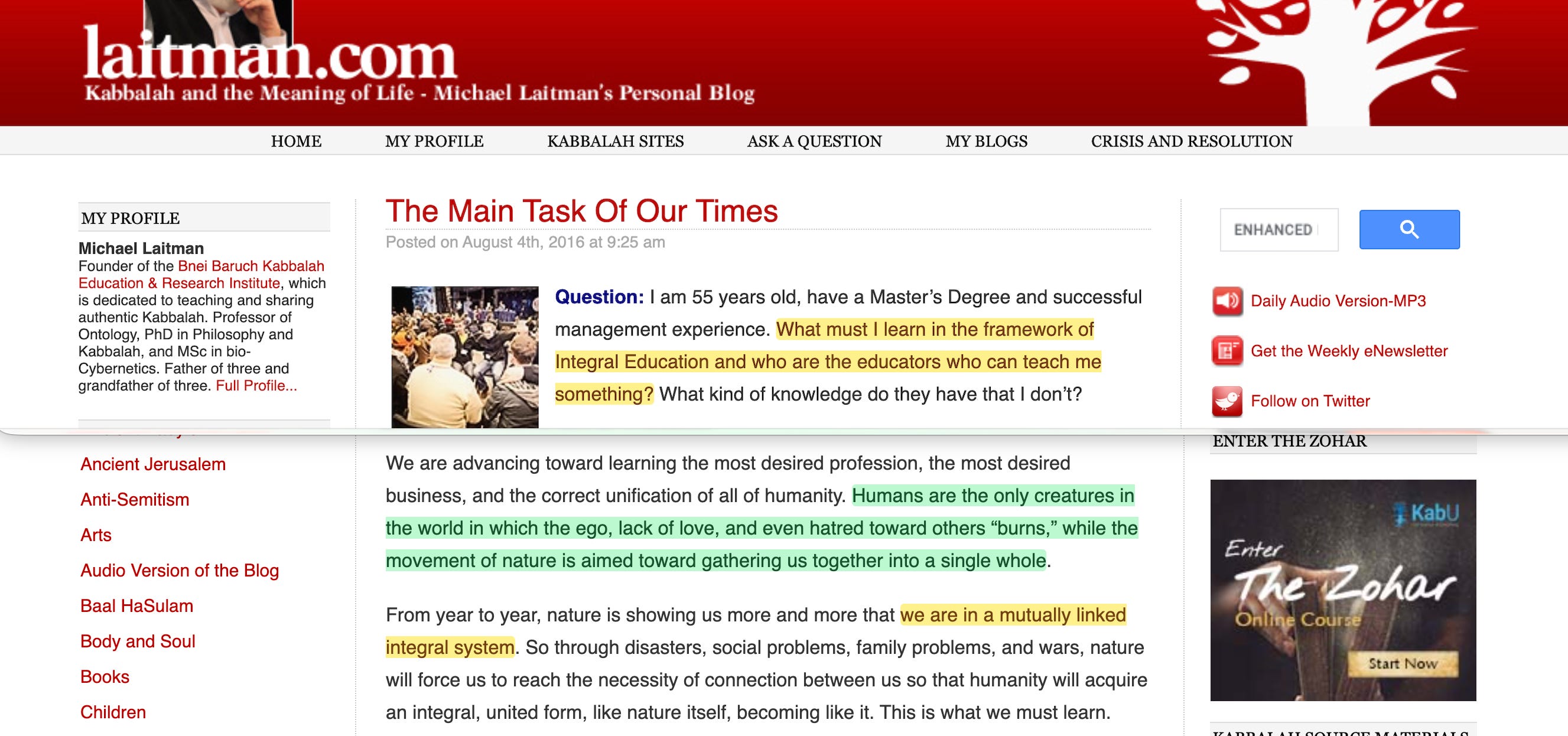 Laitman centres his entire teaching on the same opposition: egoism is the disease58, altruism the cure. He has developed what he calls Integral Education59, a pedagogical programme designed to restructure consciousness toward perceiving ‘interdependence’ as primary reality60.