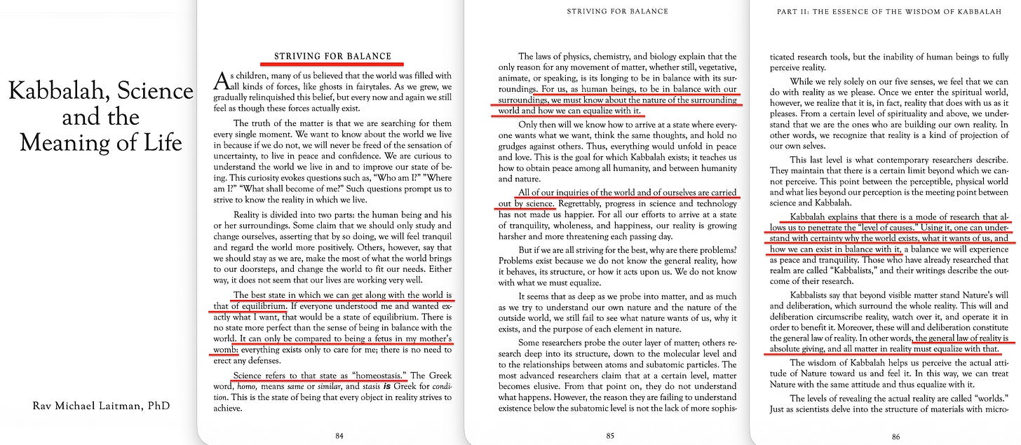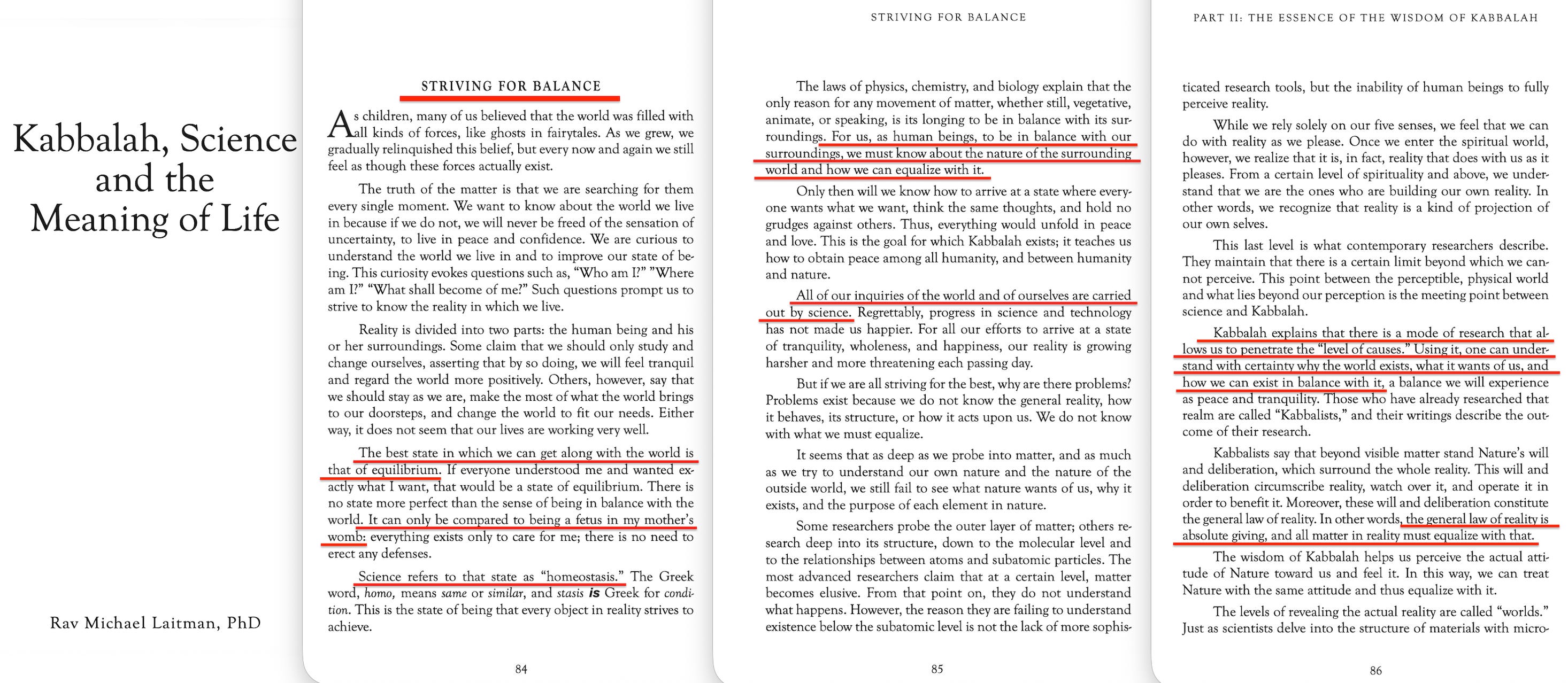 And Laitman names this explicitly. In Kabbalah, Science and the Meaning of Life79, he writes that ‘the best state in which we can get along with the world is that of equilibrium’, which ‘science refers to as ‘homeostasis’’. He then offers a striking image of what this equilibrium looks like: ‘It can only be compared to being a fetus in my mother’s womb: everything exists only to care for me; there is no need to erect any defenses’.