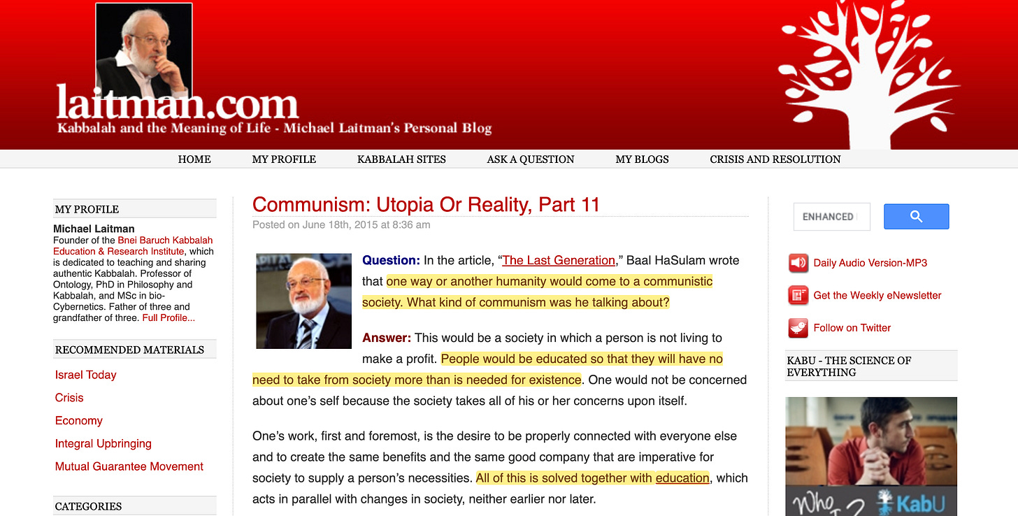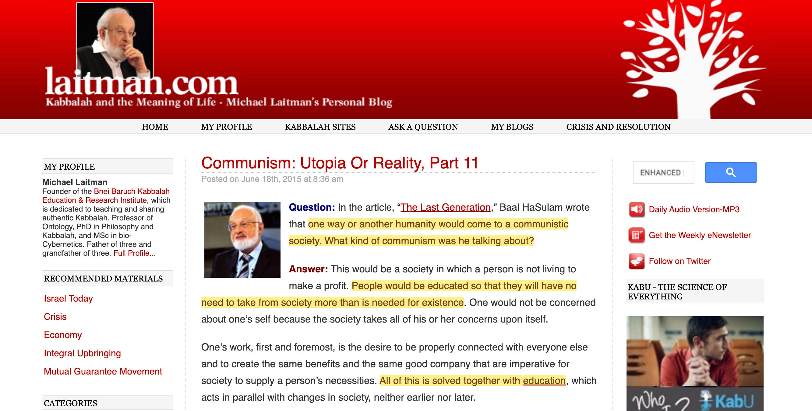 This matters, because Laitman founded Bnei Baruch10, currently the largest Kabbalah education organisation in the world11, promoting ‘ideal’, ‘moral’, even ‘perfect communism’12 which is ‘altruistic’ in an inverted sense.