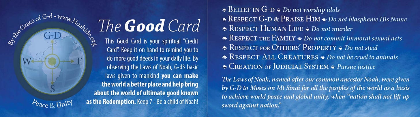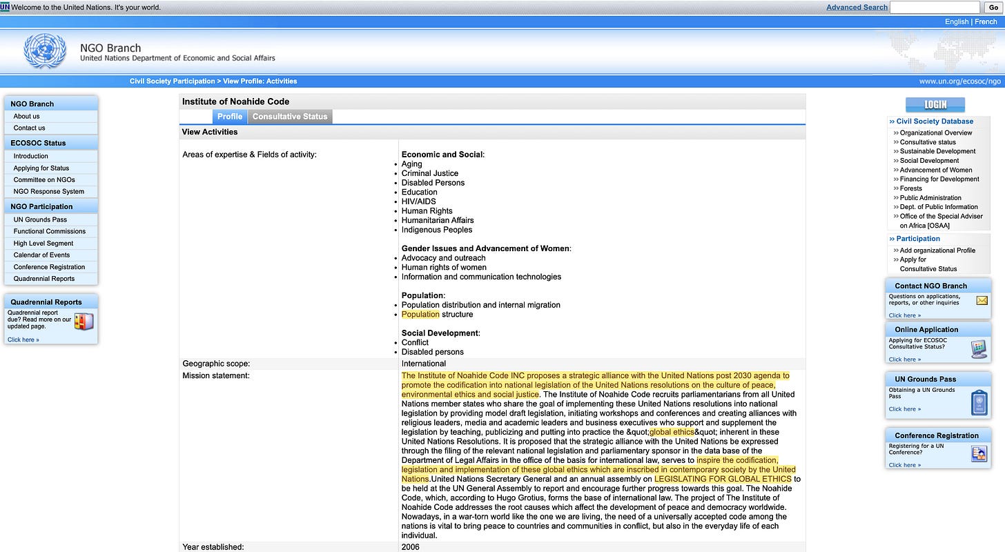In the meantime, the framework has institutional address. The Institute of Noahide Code67 holds UN ECOSOC General Consultative Status and explicitly works to codify UN resolutions on ‘environmental ethics’ and ‘social justice’ into national legislation — what they describe as ‘Legislating for Global Ethics’68. Their materials further cite Hugo Grotius, the father of international law, whom Cohen also references in Religion of Reason as praising the Noahide institution.