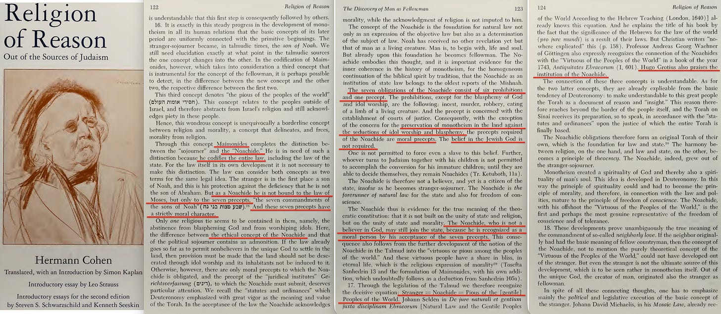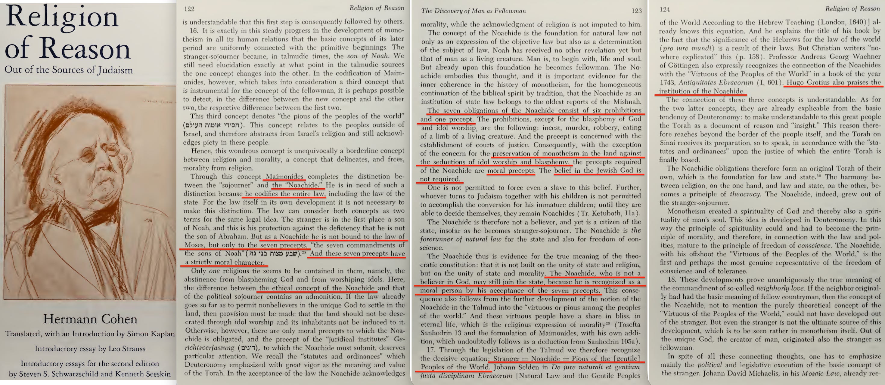 Hermann Cohen, the Neo-Kantian philosopher who founded the Marburg school, took this further. In his Ethics of Pure Will54, Cohen argued that moral agency generates its purpose from within, aligning individual aims with universal law. Crucially, in his final work Religion of Reason55, Cohen explicitly grounded this universalism in the Noahide laws — the seven commandments he saw as a basic moral foundation binding on all humanity.