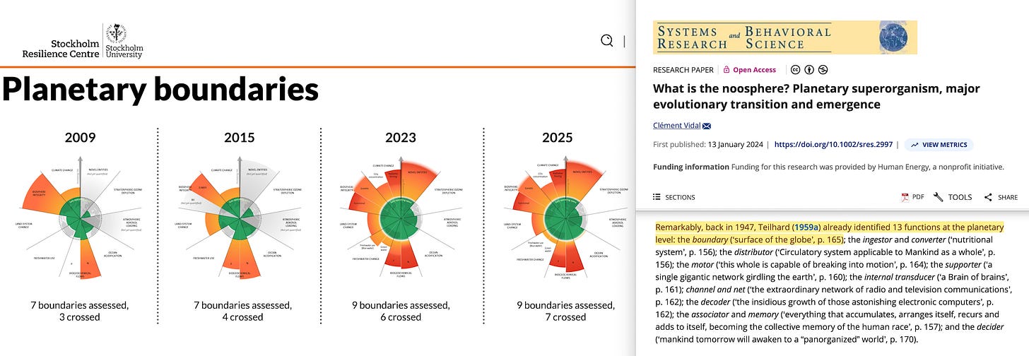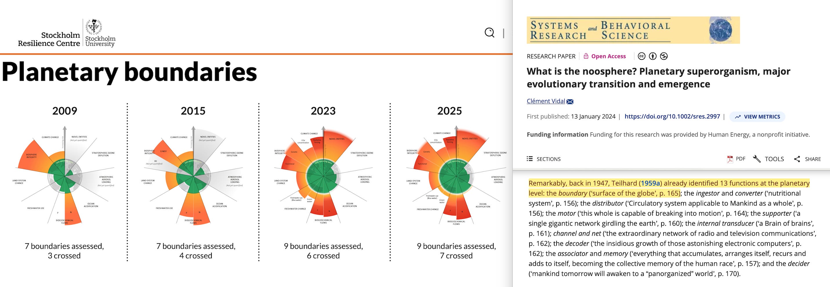 Planetary boundaries80 — the measurable parameters the Earth system must stay within — become the physiological tolerances of Teilhard’s living organism81. Your carbon budget is your allocation of perturbation allowance. Exceed it and you are ‘destabilising the planetary body’. The framing transforms economic behaviour from individual choice into potential pathology, with the ethics clearinghouse functioning as a diagnostic authority determining who is making the planet sick.
