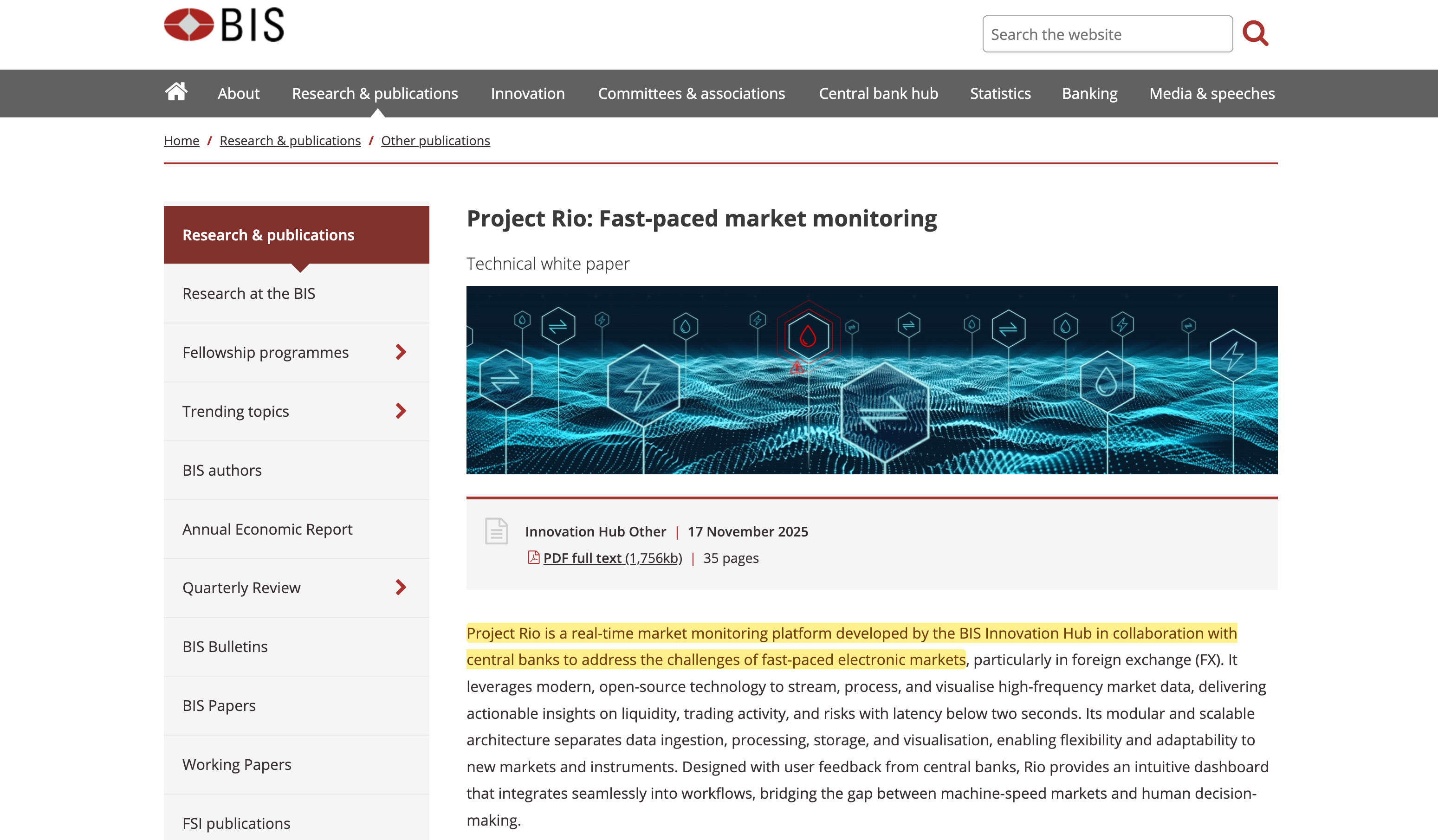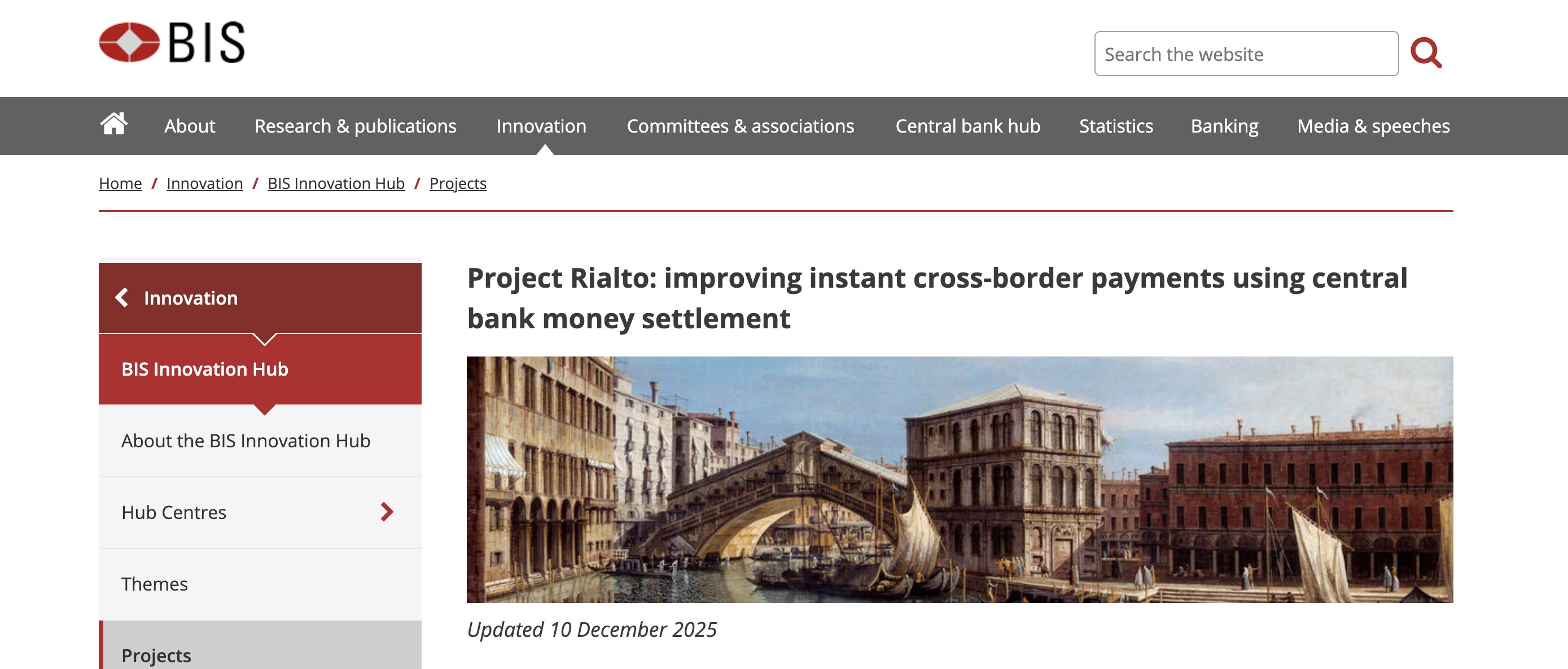 Project Rialto28, published in December 2025, combines automated foreign exchange with tokenised central bank money settlement for instant cross-border payments, building explicitly on both Mariana29 and Nexus.