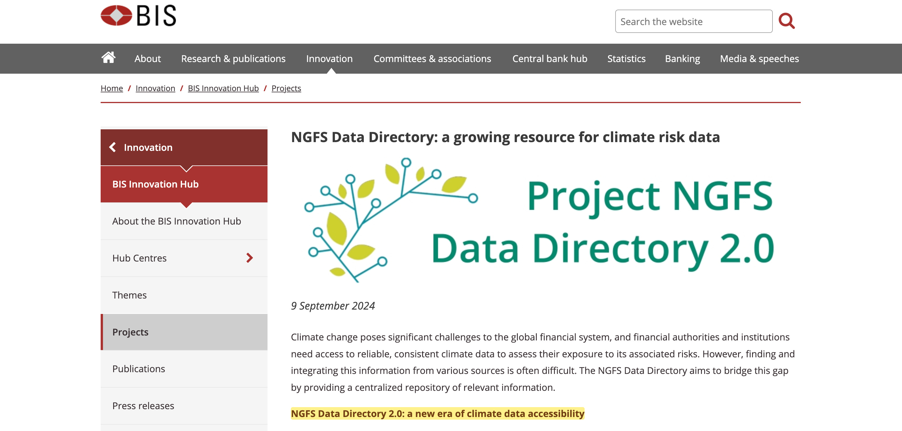 A digital twin that models flood risk can model water stress. A system that traces climate impact through supply chains can trace deforestation impact through the same chains. The NGFS Data Directory 2.044 catalogues data sources across the full environmental domain, redesigned as a public resource.
