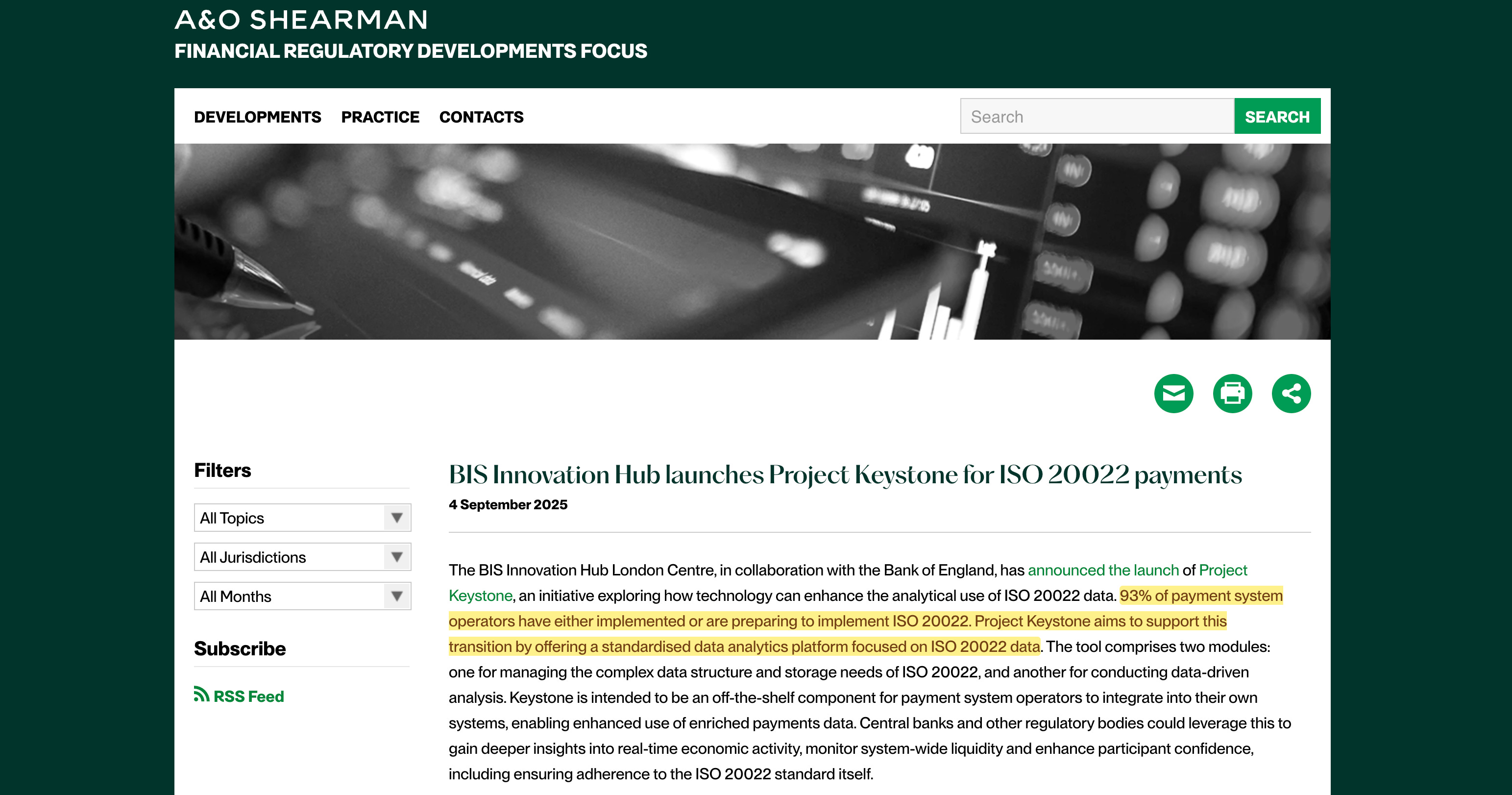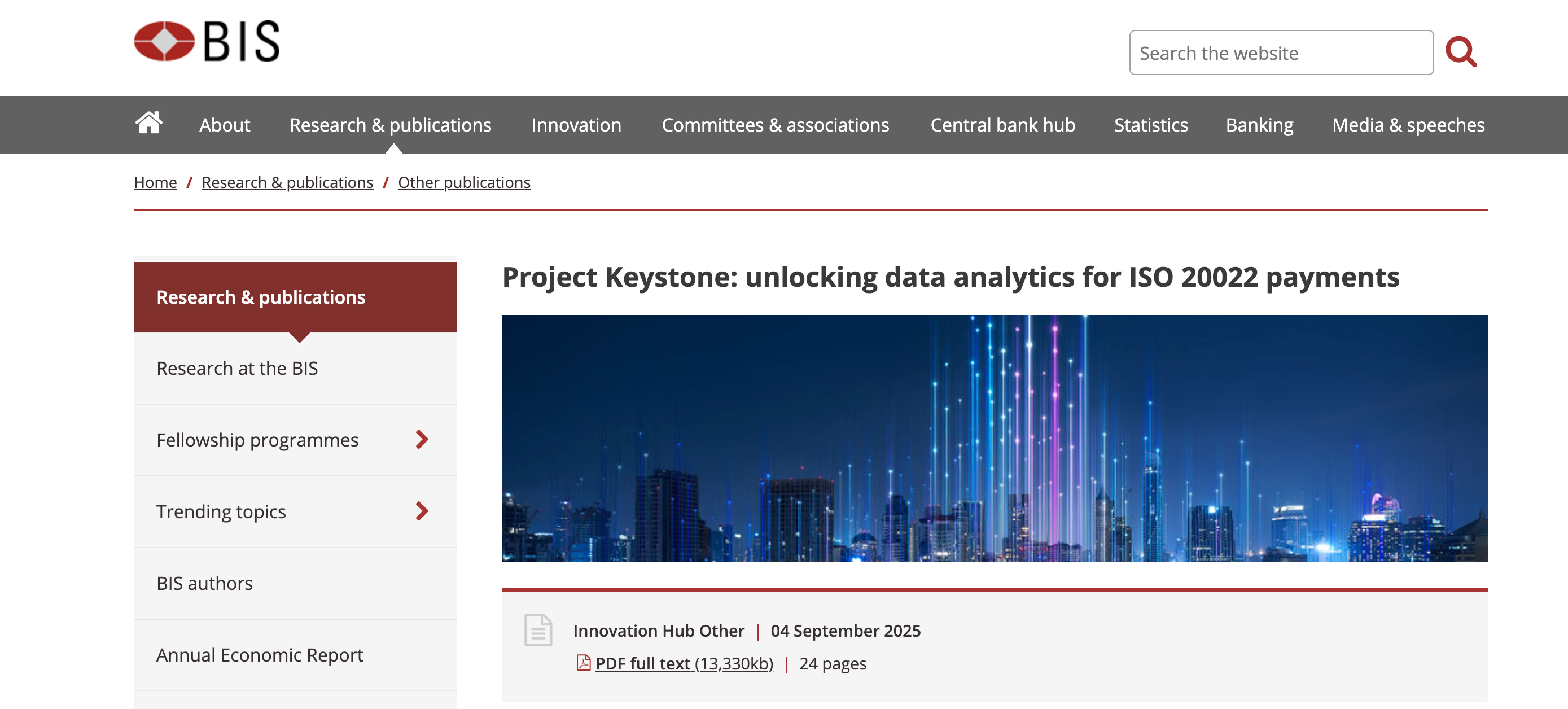 Keystone provides two modules: one for managing the complex data structure and storage requirements of ISO 20022, and another for conducting data-driven analysis. The BIS documentation describes capabilities for ‘real-time economic monitoring’ and ‘liquidity oversight’. It is designed as an off-the-shelf component that any payment system operator can integrate.