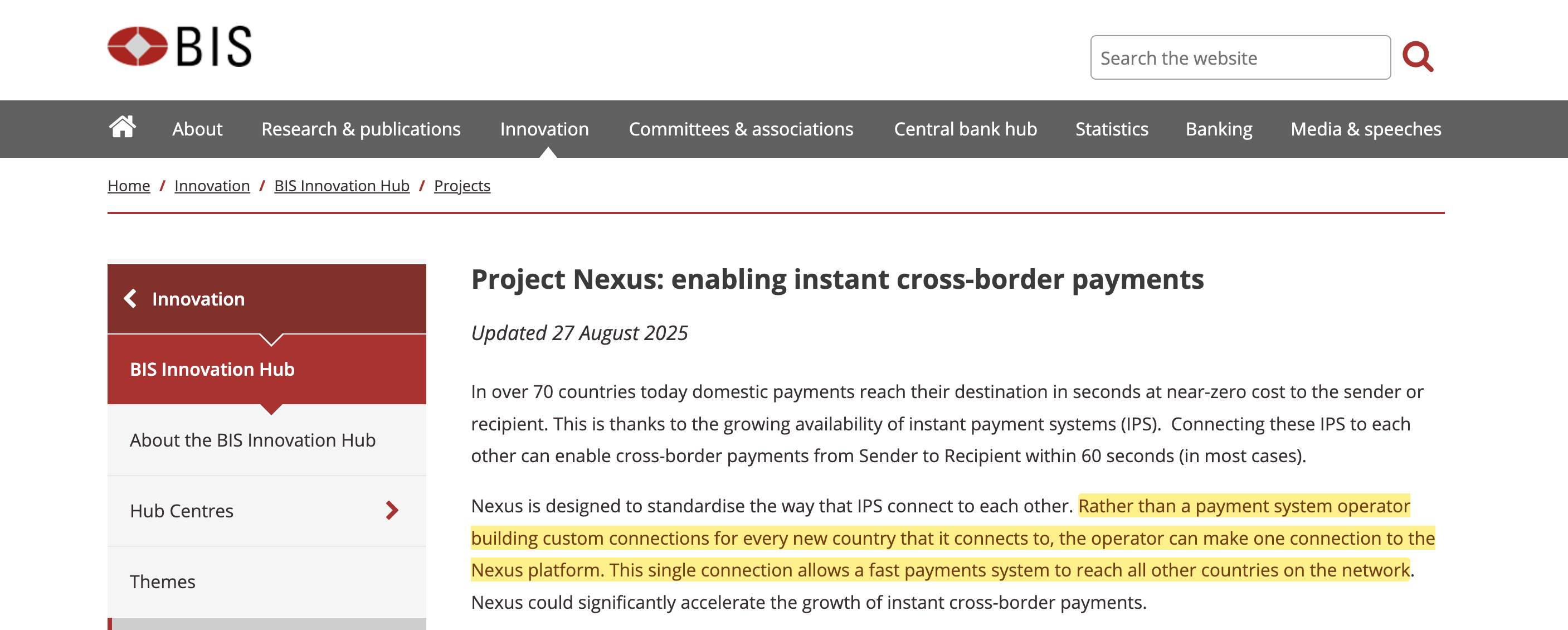 Where mBridge25 and Icebreaker26 require CBDC adoption, Nexus works with existing payment rails. The cross-border payment plumbing does not depend on any single jurisdiction’s decision to issue a digital currency; it is being built on what already exists.