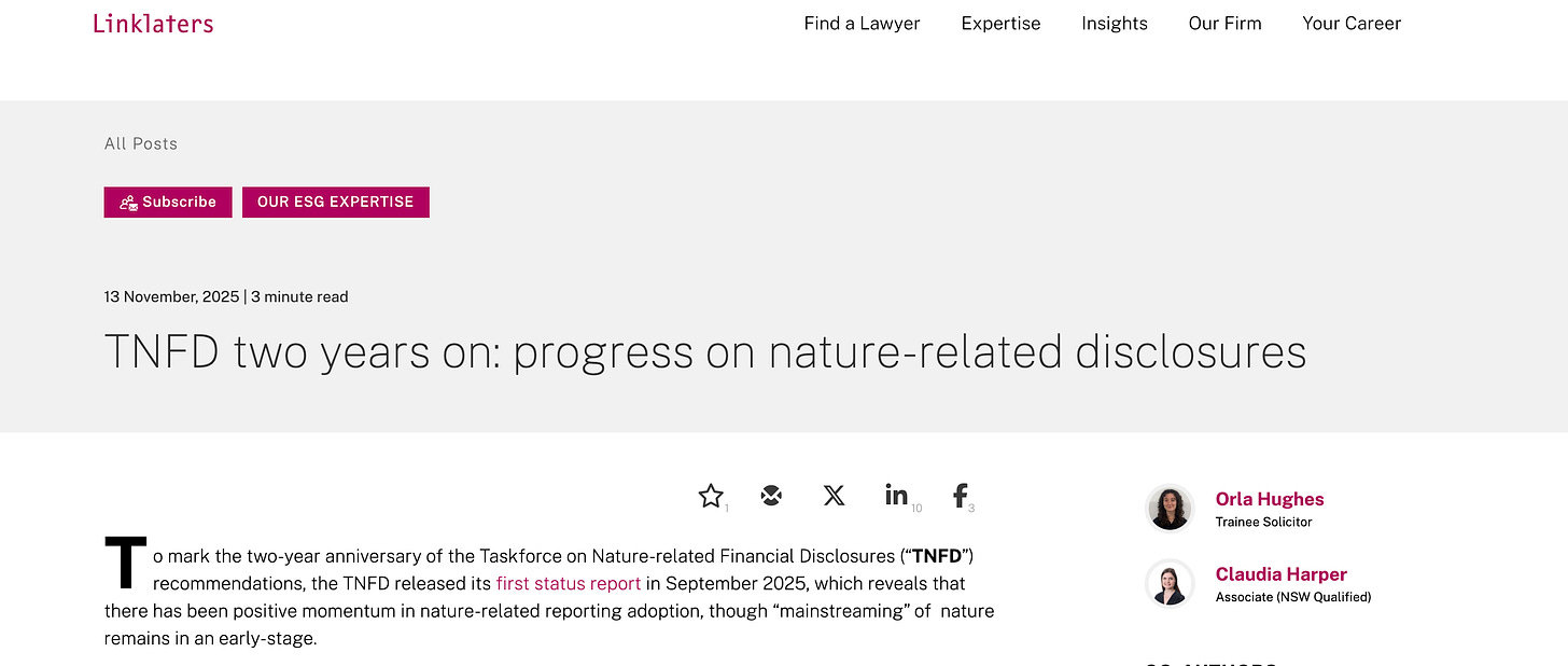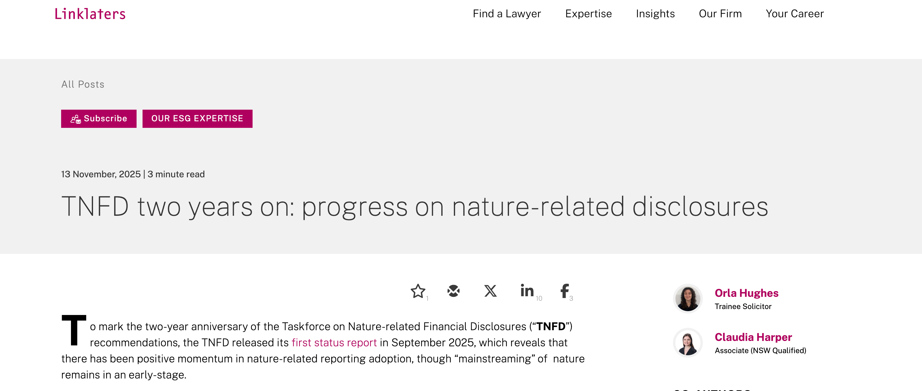 The TNFD signed a memorandum of understanding with the IFRS Foundation in 2025, aligning it with the International Sustainability Standards Board41 (ISSB) — the same body that globalised climate disclosure by absorbing the TCFD recommendations into mandatory reporting standards42.
