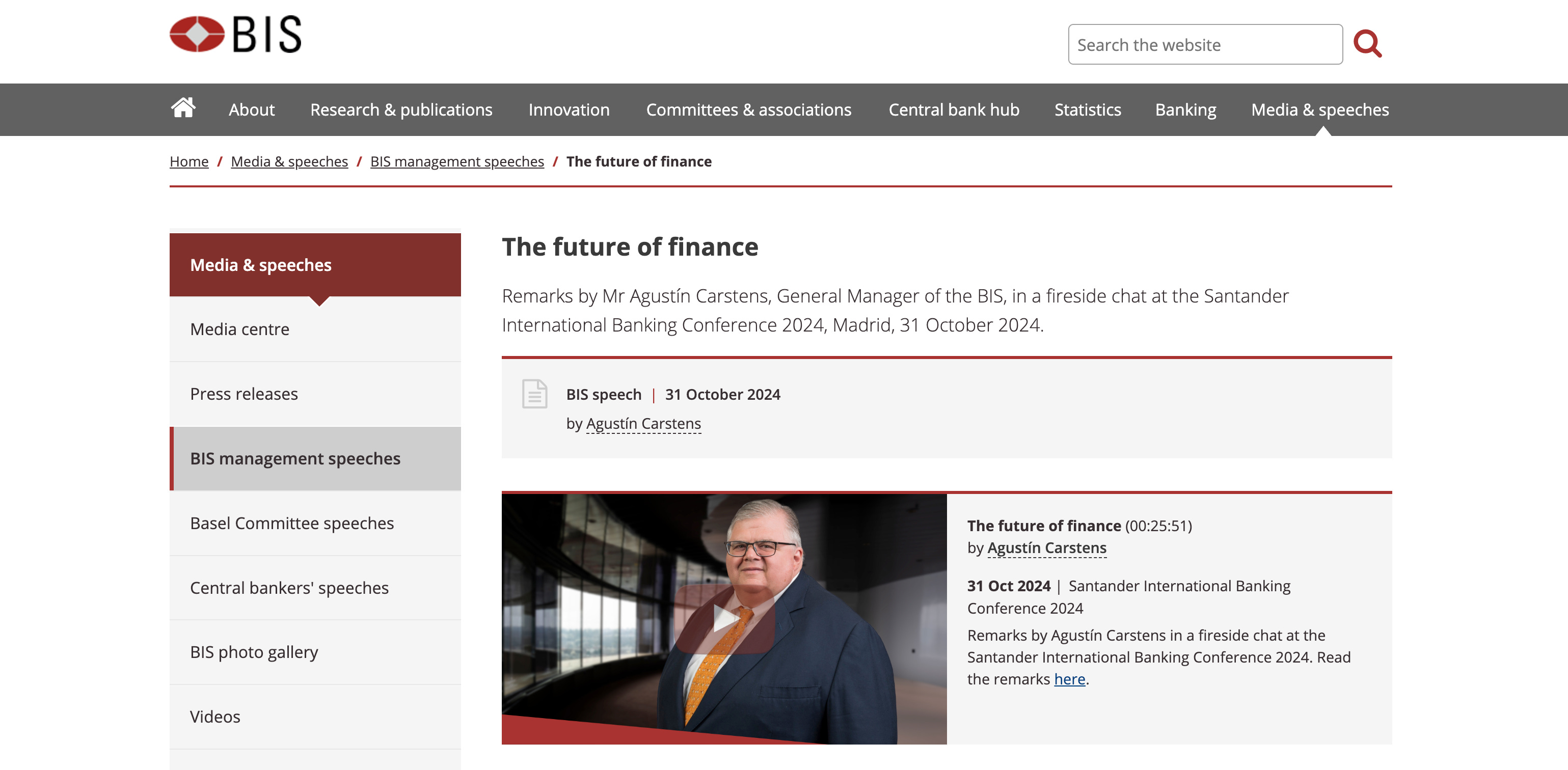 Carstens described the end state at the Santander conference in October 2024: a system in which ‘individuals and businesses could transfer any financial asset, in any amount, at any time, using any device, to anyone else, anywhere in the world’ — subject to compliance rules embedded in the transfer protocol itself67.