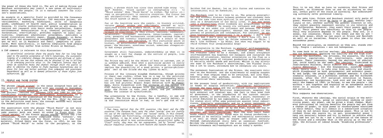 Next, Marc tells us that the term The Third System was first coined between 1978 and 1980—which is interesting in itself, considering Marc Nerfin had already titled a full chapter titled as such in those exact words in Partners in Tomorrow covered above, complete with a foreword dated… February, 1978.