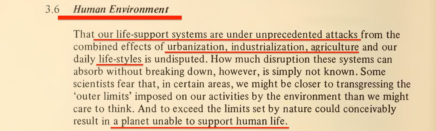 We skip straight to Chapter 7. Sure, we could dissect the earlier chapters line by line, but let’s just point out that the word ‘environment’ appears 167 times throughout the book—so there’s no real ambiguity about the context. And if that’s still not enough, Chapter 3 leaves no doubt about the Club of Rome’s 'green' ideological foundation.
