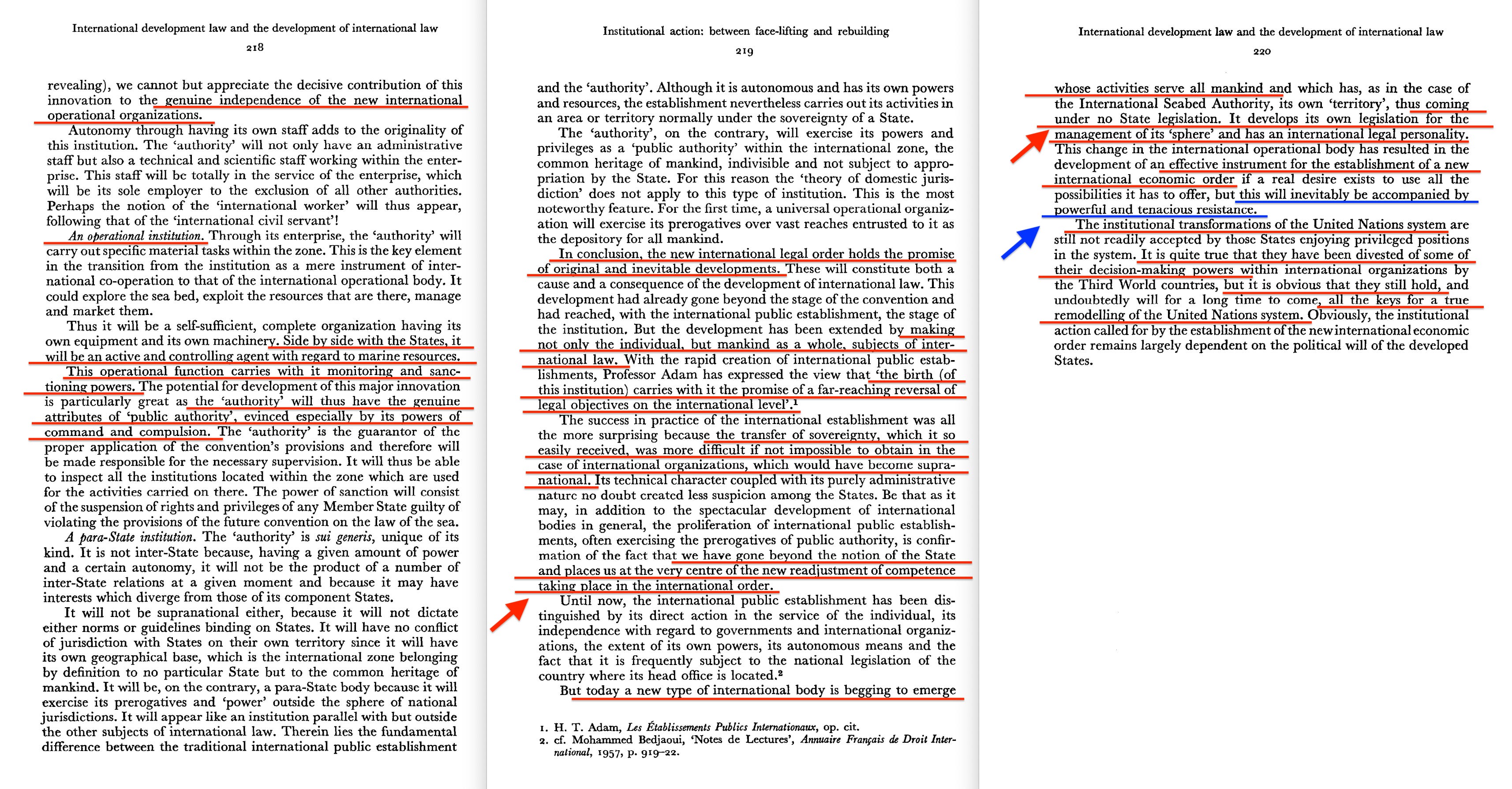 It is thus interesting to observe the vigorous development of international law in order to by-pass the sacrosanct principle of State sovereignty. After first addressing itself to States through the traditional international organizations of the United Nations system, the international institution then placed itself at the service of man as an individual in the form of the international public establishment, and is now attempting to reach mankind as a whole through the direct management of the common heritage of mankind,