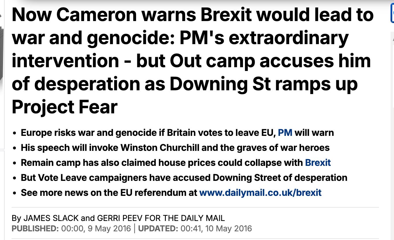 Ah, yes. Through balanced and moderate threats of Nuclear Armageddon. Cool story, bro. The fear-mongering is dialled up to 11—just like when David Cameron warned of World War III if we dared reject the hyper-corrupt6 European bureaucracy7.