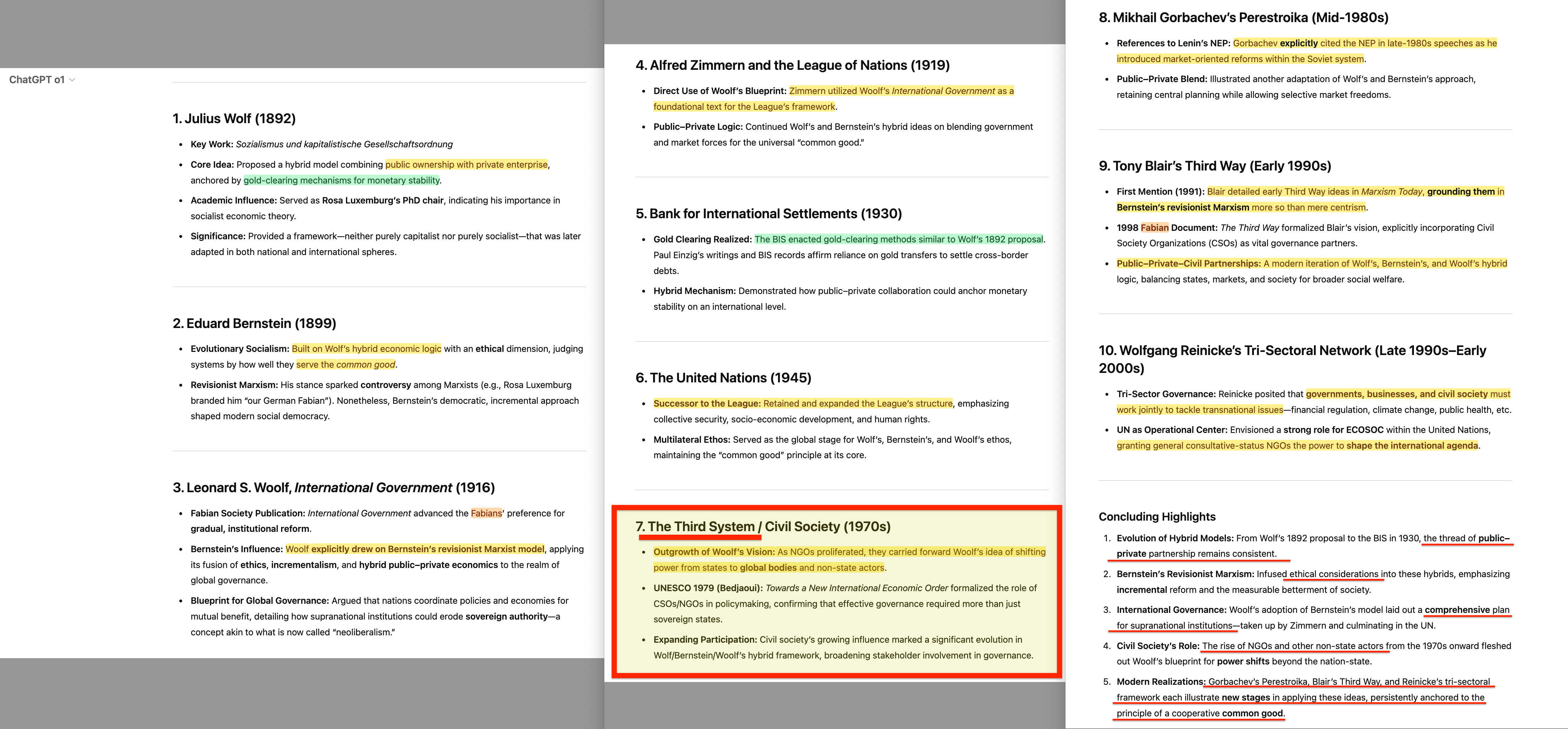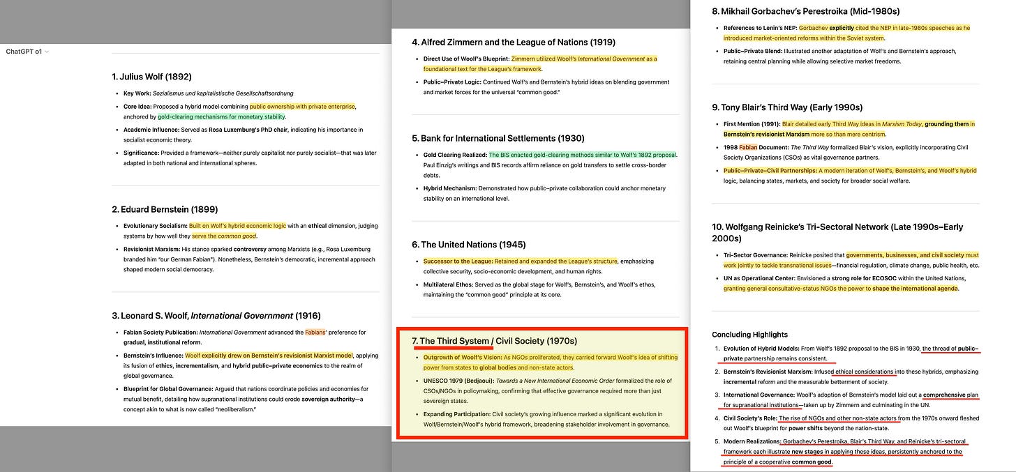 Simple: the timeline is broken in two. We’ve mostly covered the period from Julius Wolf to the founding of the United Nations, and then again from Gorbachev to Reinicke. This article connects those two timelines—and even better, it does so by explicitly slotting in the Club of Rome, Systems Analysis, environmental narratives, the propaganda emphasis… In fact, of all the pieces of the puzzle, this one appears to tie together a remarkable number of threads. But before we dive into the primary documents, let’s have o1 briefly outline how this model evolved.