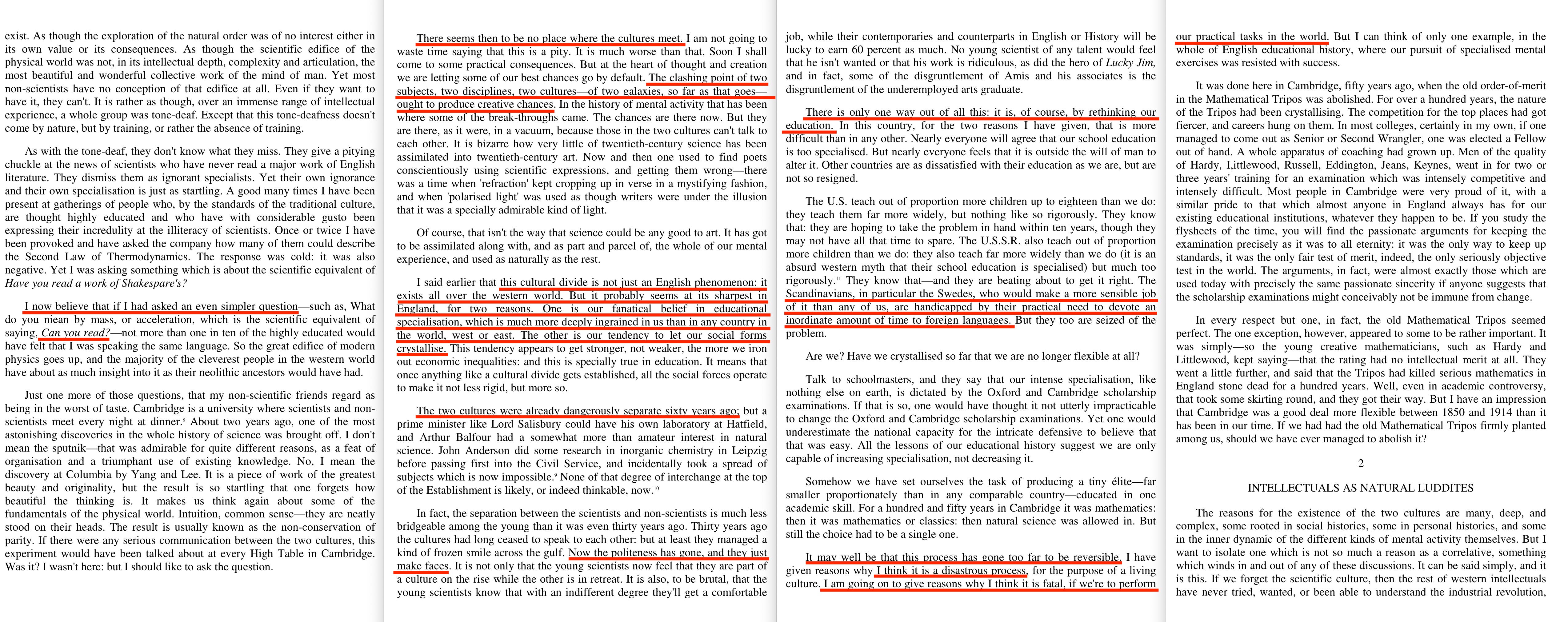 ‘There seems then to be no place where the cultures meet. I am not going to waste time saying that this is a pity. It is much worse than that. Soon I shall come to some practical consequences. But at the heart of thought and creation we are letting some of our best chances go by default. The clashing point of two subjects, two disciplines, two cultures—of two galaxies, so far as that goes— ought to produce creative chances.‘
