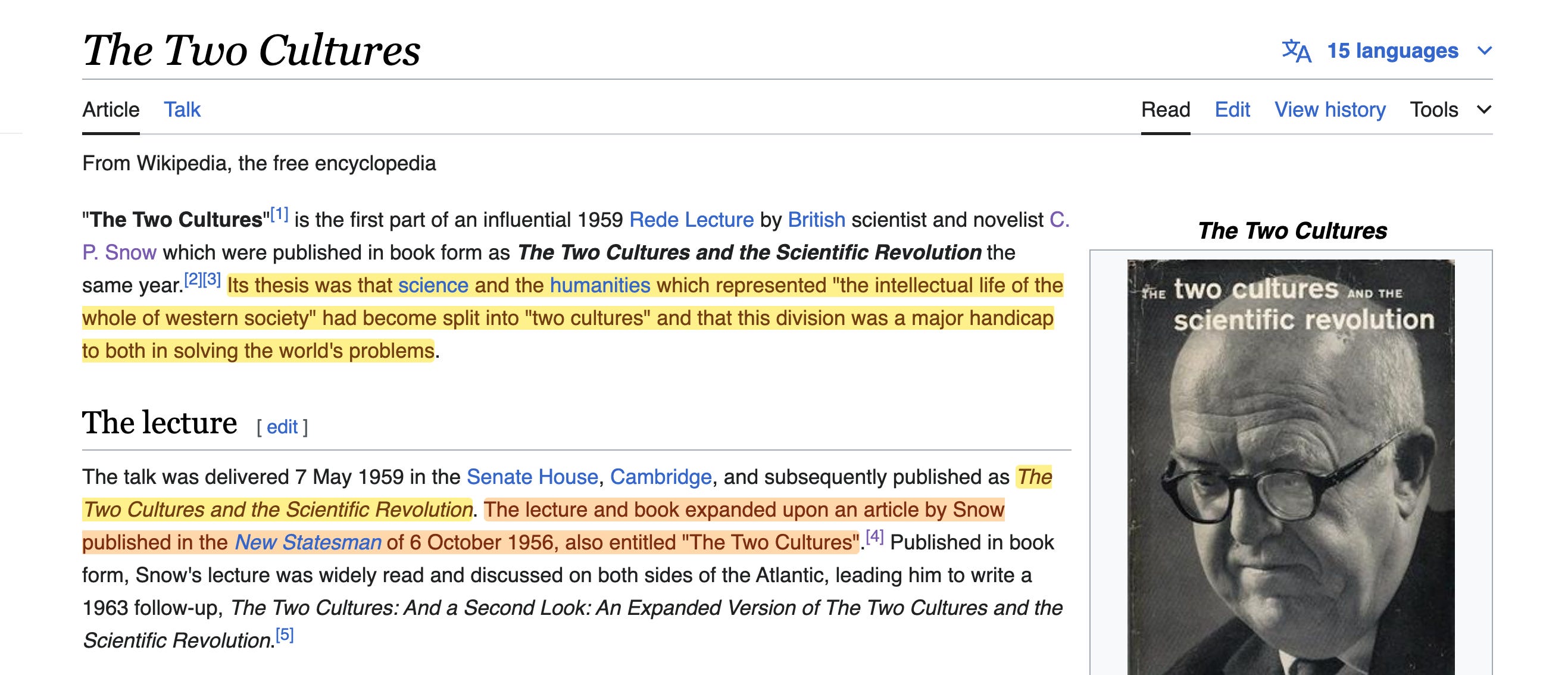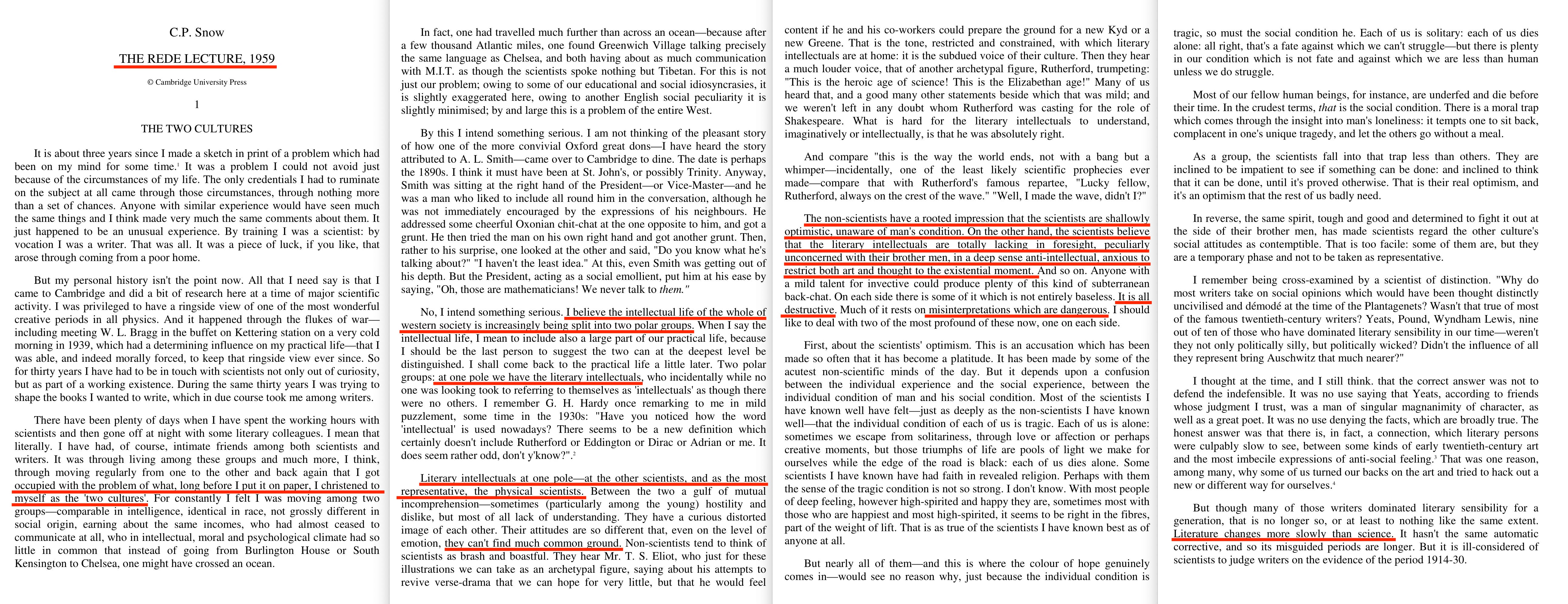 Incidentally, this isn’t just my take on it. It’s also that of Wikipedia4… which goes on to identify that the 1959 lecture in fact is a later iteration itself, of a 1956 article in the New Statesman.