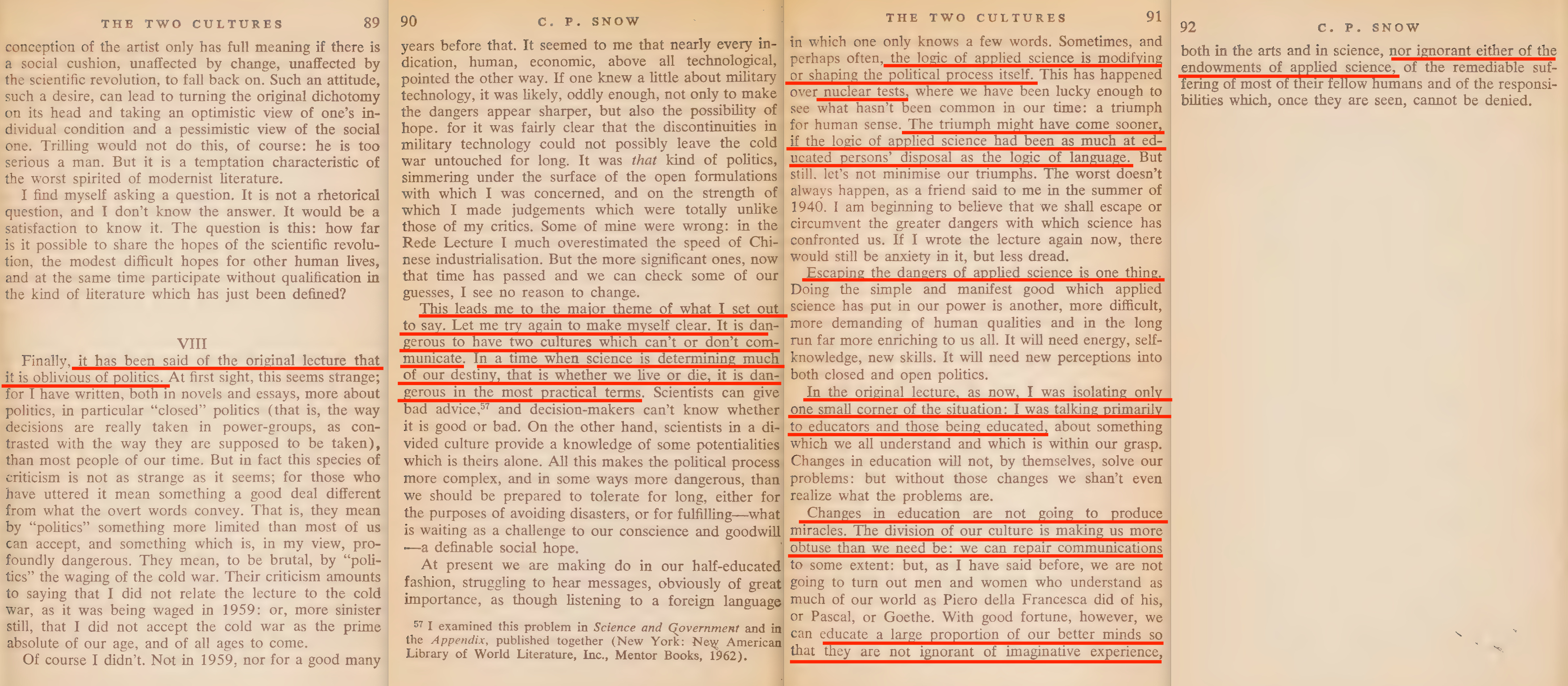 ‘This leads me to the major theme of what I set out to say. Let me try again to make myself clear. It is dangerous to have two cultures which can’t or don’t communicate. In a time when science is determining much of our destiny, that is whether we live or die, it is dangerous in the most practical terms. Scientists can give bad advice, and decision-makers can’t know whether it is good or bad.’