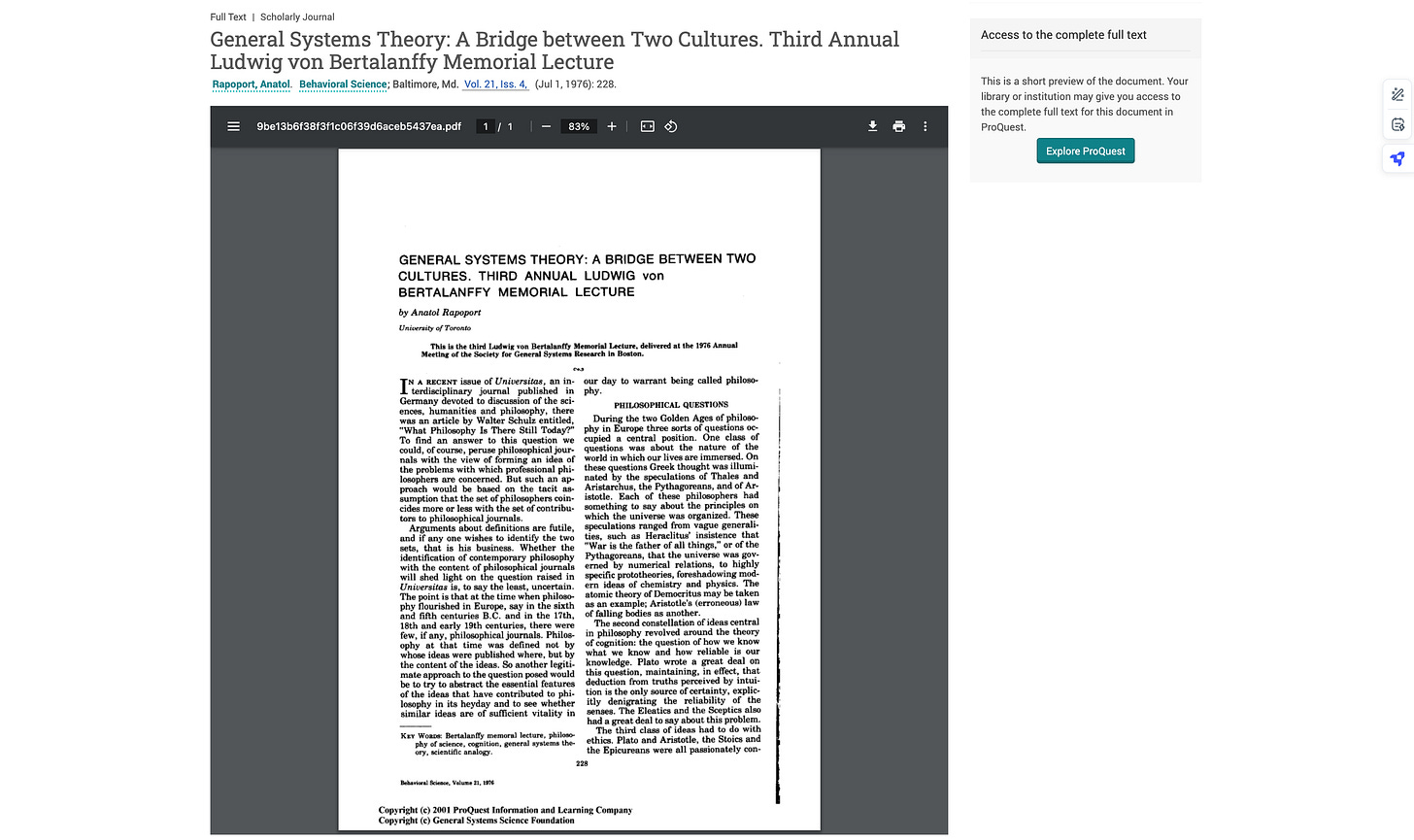 A few years down the line, Anatol Rapoport took the baton, through his 1976 lecture, ‘General Systems Theory: A Bridge between Two Cultures. Third Annual Ludwig von Bertalanffy Memorial Lecture‘6. Do try to act all surprised that the solution here comes through General Systems Theory, as suggested by Rapoport -