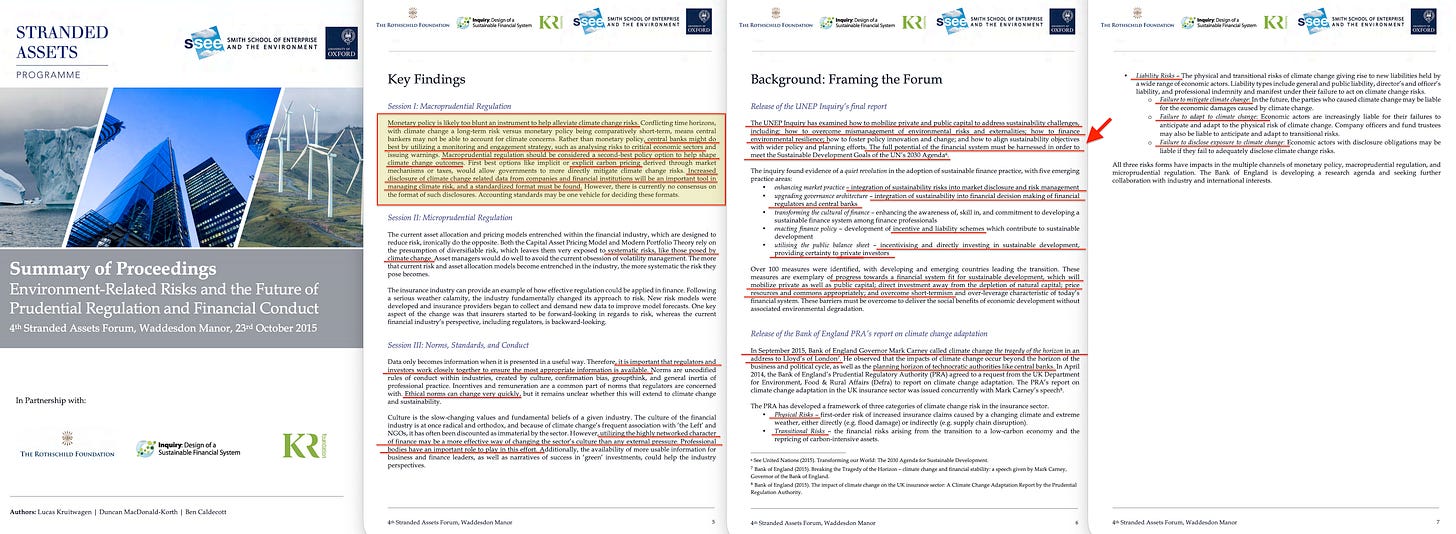 The proceedings note the forum26 ‘coincided with’ Mark Carney’s ‘Tragedy of the Horizon’ speech27, delivered three weeks earlier. The participant list explains why coincidence is the wrong word: Sandra Batten (Senior Economist, Bank of England), Matthew Scott (Team Leader Environmental Risks, PRA), Sini Matikainen (ESRB Secretariat, ECB), Per Bolund (Swedish Finance Minister). Rupert Thorne (Deputy Secretary General, Financial Stability Board) delivered closing remarks.
