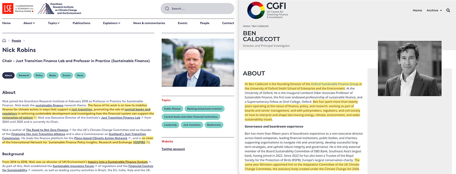 The scenarios reviewed came largely from the network’s own members. The paper drew on HSBC’s reports — HSBC was a funder. It analysed Standard & Poor’s work — S&P was listed as a ‘non-funding partner’. It relied on UNEP scenarios — Nick Robins would become UNEP Inquiry Co-Director later that year. It acknowledged that ‘much of the analysis is based on the idea of ‘unburnable carbon’ recently taken forward by the Carbon Tracker Initiative’ — Carbon Tracker was founded by Mark Campanale, who had co-developed the stranded assets concept with Robins at Henderson Global Investors in 2001.