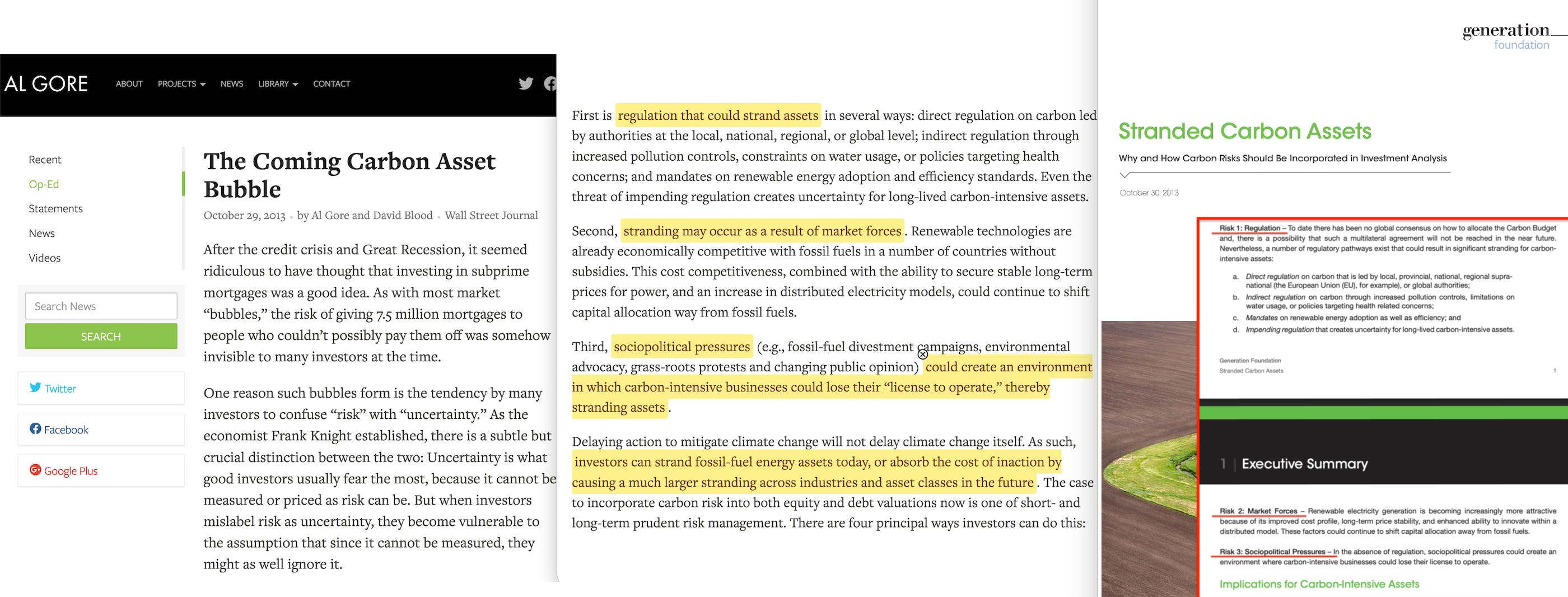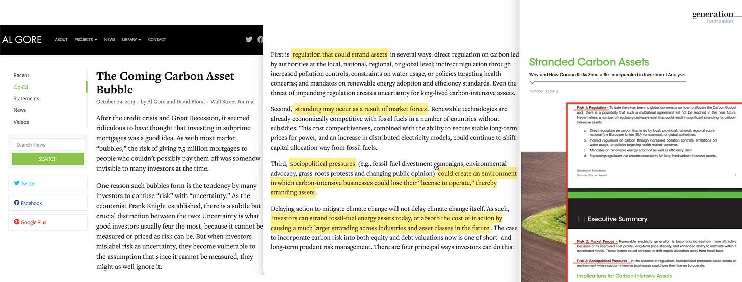 On October 29, 2013, Gore and Blood published ‘The Coming Carbon Asset Bubble’ in the Wall Street Journal15, framing carbon risk as analogous to subprime mortgages, and carbon risk as a certainty. Gore is, in effect, telling you about what’s coming: