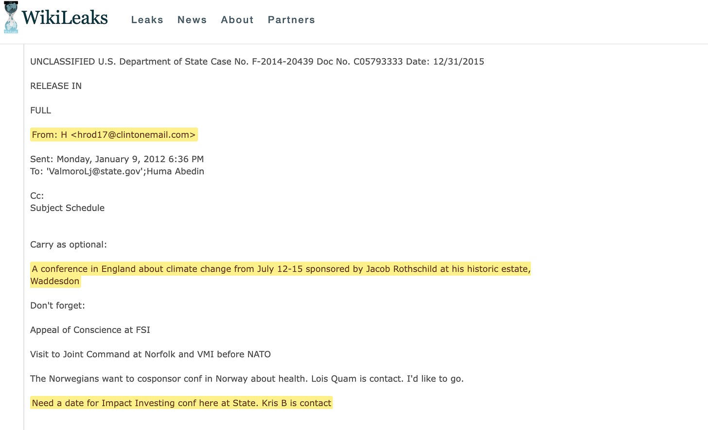 The Secretary of State was invited to attend a conference at Waddesdon Manor by Jacob Rothschild two years before the first Forum convened, with a date for an Impact Investment conference needed for ‘Kris B’ at the State Department.