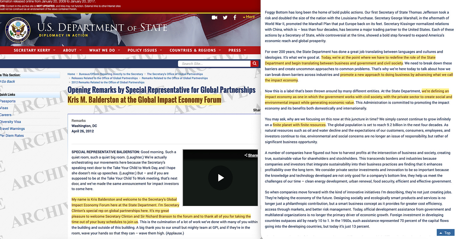 ‘Kris B’ almost certainly refers to Kris M. Balderston, and the conference the Global Impact Economy Forum6, held in late April, 2012. Then follows an ‘impact economy’ description best summarised as a ‘public-private partnership for the common good’ funded through ‘blended finance’, where the ‘common good’ relates to a social or environmental objective, defined by a foundation front ‘civil society organisation’.