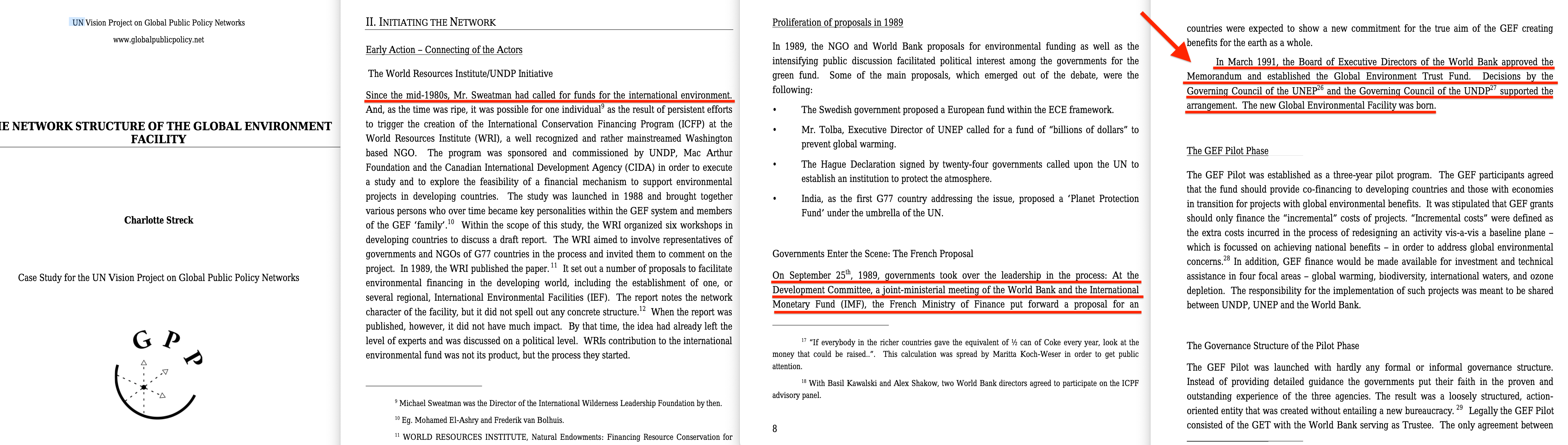 'Negotiations for both the Pilot Phase in 1991 and the restructuring in 1994 were complex… the idea of a World Conservation Bank was floated from the mid-1980s onwards and was the subject of a flurry of proposals in the years after the landmark Brundtland Report included this idea in 1987. In 1989, the French Finance Minister to the Development Committee of the World Bank and International Monetary Fund put forward a proposal, solidly backed up by some $100 million, which eventually led to the establishment of the GEF in its Pilot Phase'