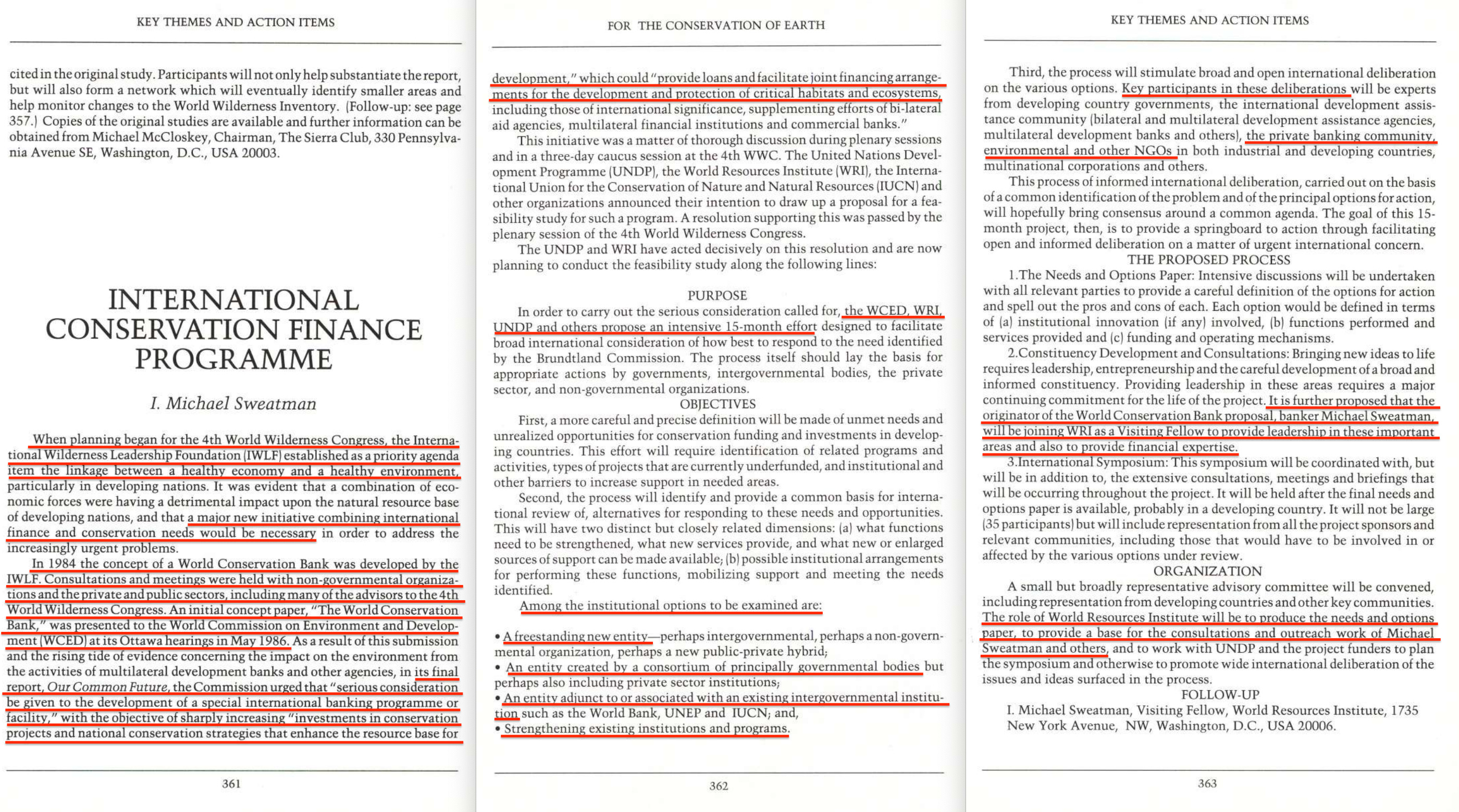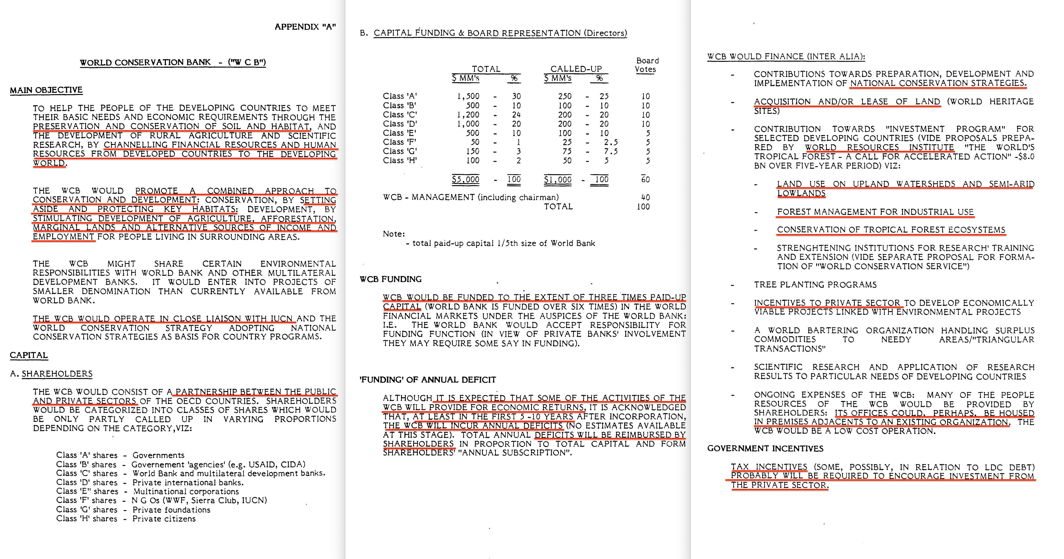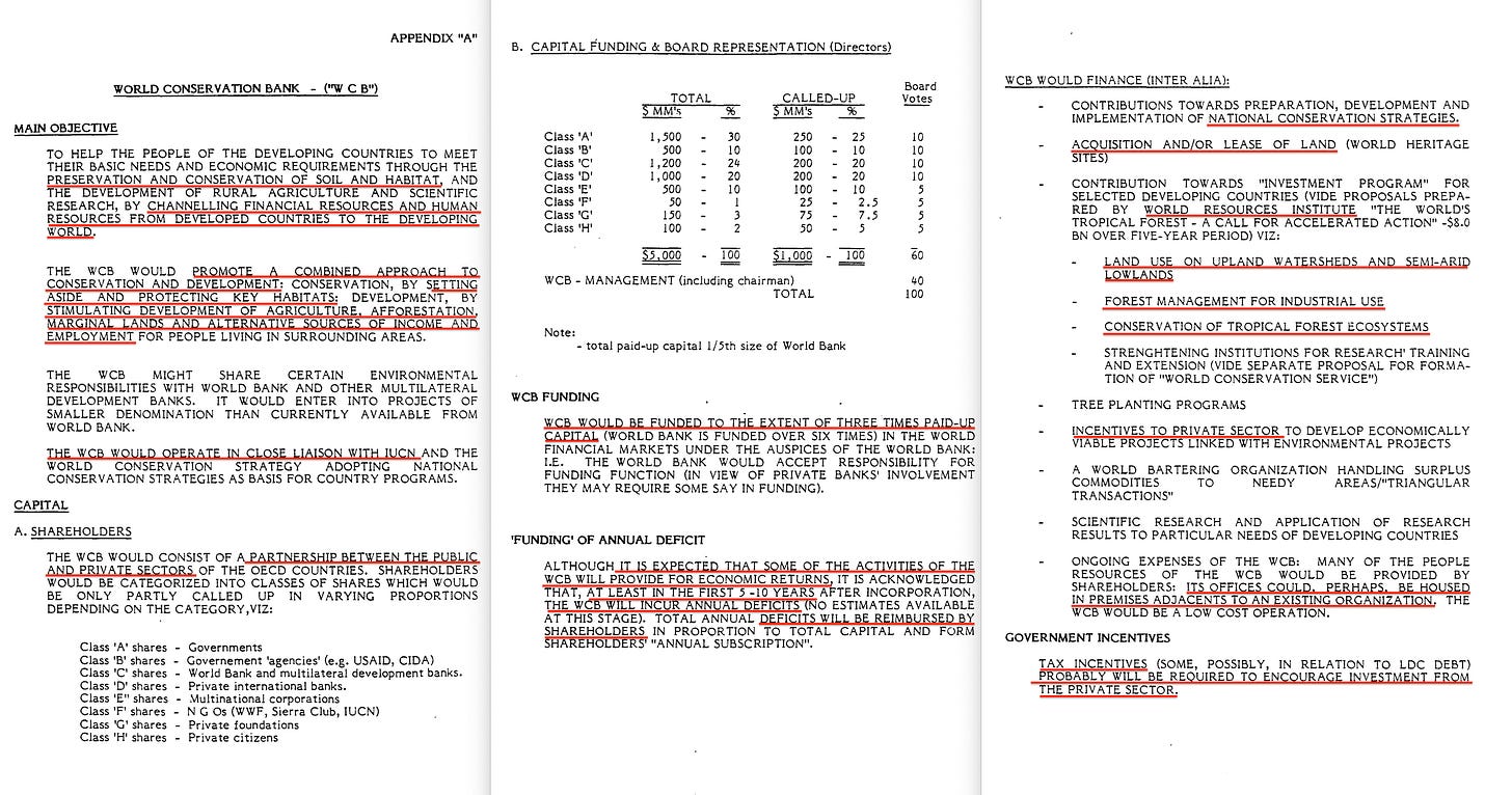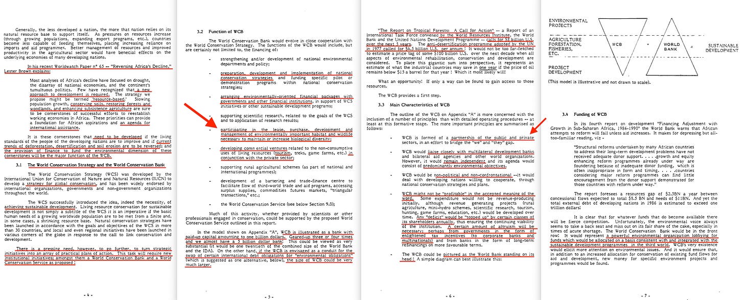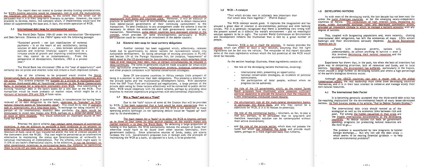 Next, let’s check out what’s in that 1986 paper, titled ‘THE WORLD CONSERVATION BANK‘6. It’s… fairly thorough, covering the roles of the US Government, multilateral development banks, commercial banks, the private sector and so forth. Even includes the educational arm of the constuct; the World Conservation Service.