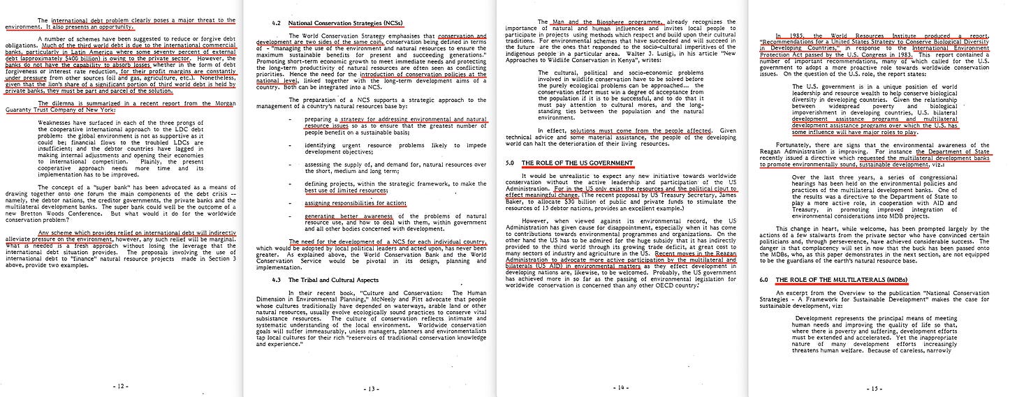 Also of significance is the consideration of this being an opportunity, because at the time (1985), $400bn of underperforming debt is owed to the commercial banks, who cannot swallow 80% losses of that portfolio. It would, in short, sink the entire banking sector, meaning that the opportunity here is a covert bailout using taxpayer funds. We then move onto national conservation strategies, linking conservation with development, in order to get the best use out of limited resourced, assigning responsibility for action, and generate better awareness. Further, UNESCO’s Man and the Biosphere programme is looped in, which is where we find those Biosphere Reserves they later monetised, of course.