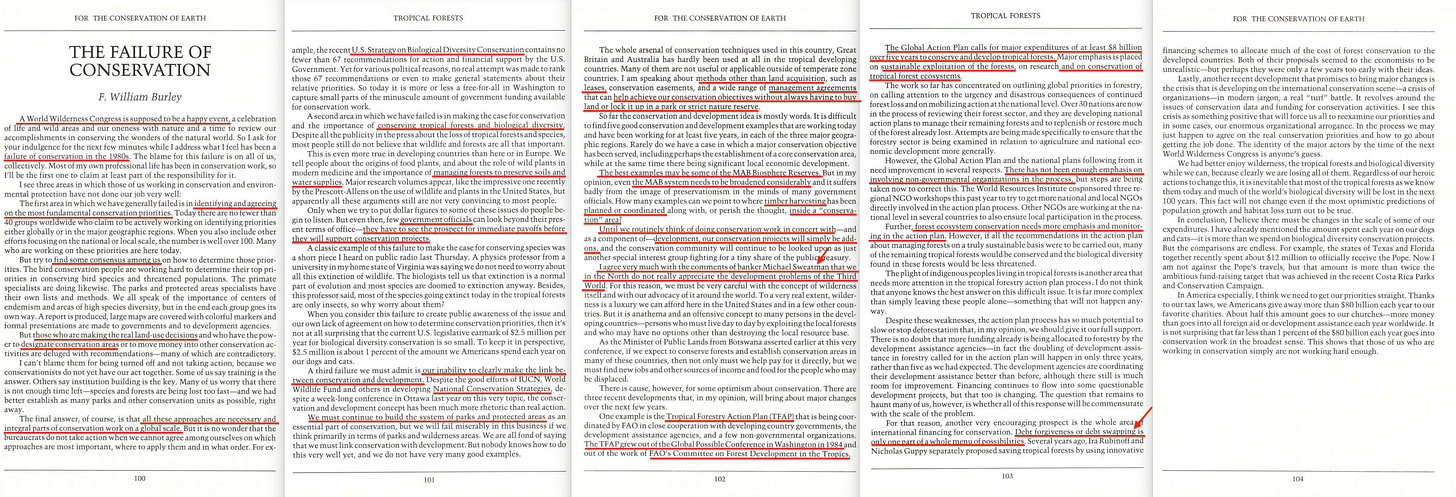 But a core issue is that the North doesn’t really understand the development problems of the Third World. Actually, that’s not his comment - that’s where the ‘banker Michael Sweatman’ comes in. But some bright sparks exist, of which one is the Tropical Forestry Action Plan, born out of the Global Possible Conference in Washington in… 1984. Which is the same year Thomas Lovejoy suggested debt-for-nature swaps as a solution for… well, something. Depends on the angle you look at it.